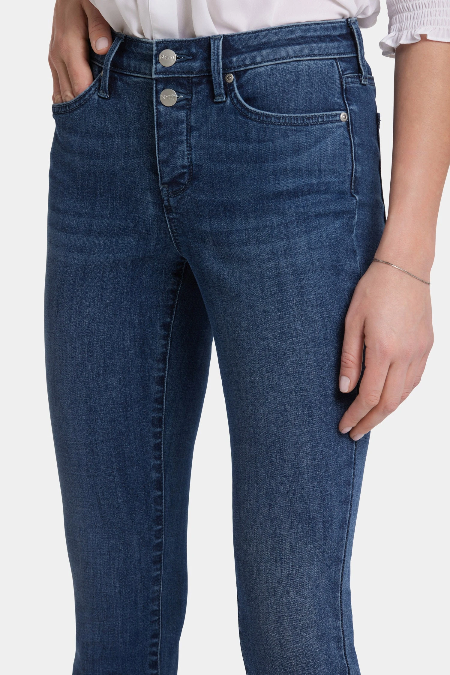 NYDJ’s Ami Skinny Women’s Jeans With Exposed Button Fly flatter every inch of you, giving you the sculpted legs, tucked tummy and lifted curves you’ll love. A front placket with concealed snap and exposed two button fly lend this flattering style a unique touch. Our breathable Cool Embrace® Denim technology wicks away moisture and keeps you feeling cool, while our unique Lift Tuck® Technology uses a proprietary slimming panel with a patented criss-cross design for a more slender silhouette. Features classic five-pocket styling.