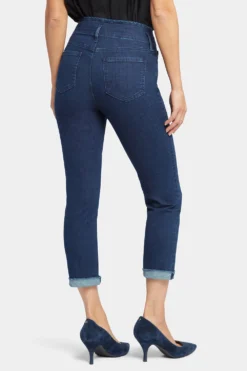 NYDJ’s Ami Skinny Jeans with High Rise flatter every inch of you, giving you sculpted legs, a tucked tummy and lifted curves. Our unique Lift Tuck® Technology helps flatten in the front by using a proprietary slimming panel with a patented criss-cross design, while an extra-high waist emphasizes the curvy silhouette. Features classic five-pocket styling, zip fly and button closure. Dimension is a dark indigo wash featuring light whiskering on the front hips and gentle sanding on the thighs and seat. This jean is made with earth-friendly methods that result in reduced consumption of water, chemicals and/or energy and with a sustainable polyester fiber created from 100% post-consumer plastic waste, resulting in less water and energy use and fewer greenhouse gas emissions without changing the look and feel of the fabric.
