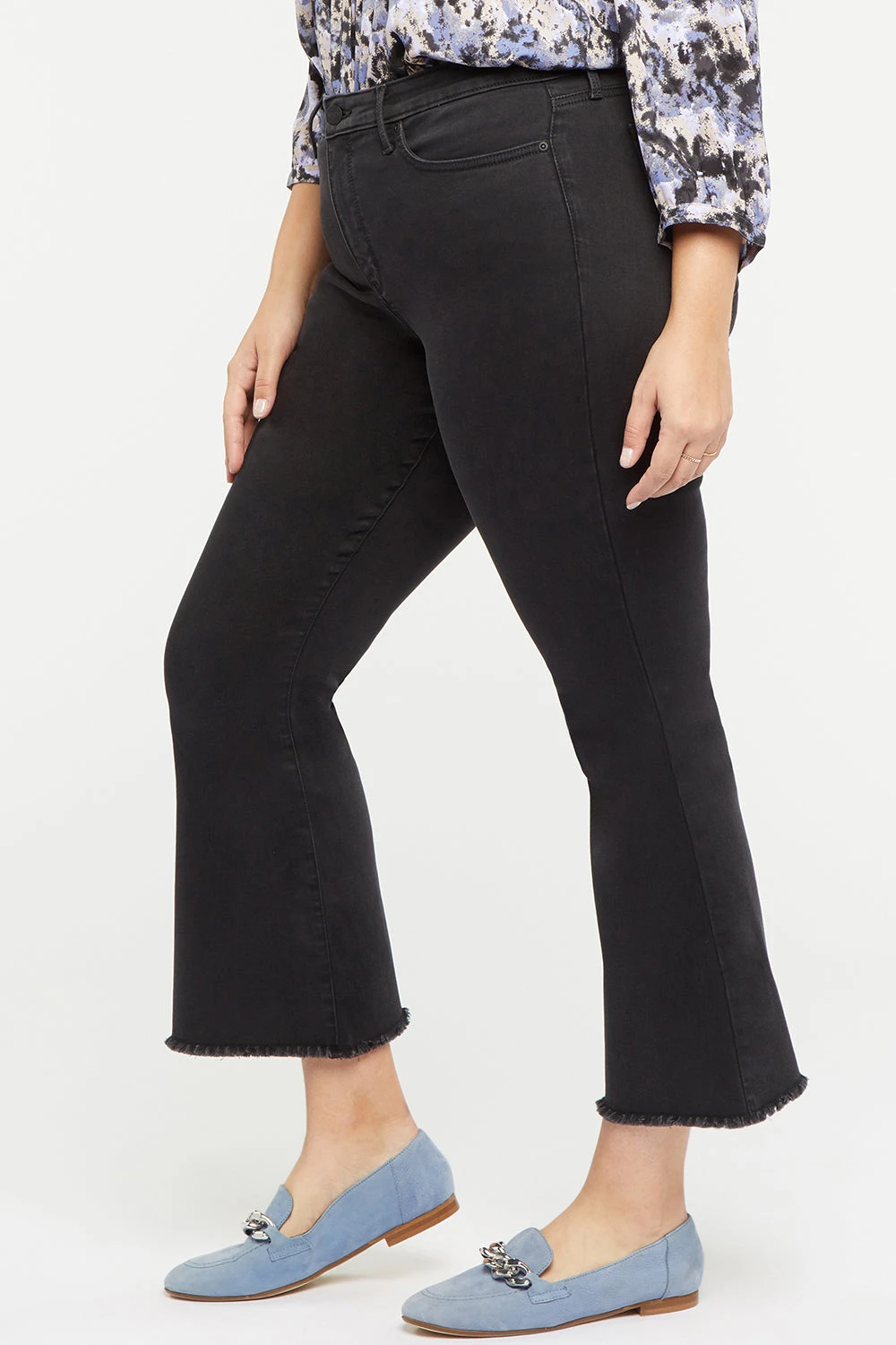 Major flare, major style. NYDJ’s Ava Flared Ankle Jeans in Plus Size with Frayed Hems have a dramatic, on-trend look you’ll love to show off. The silhouette hugs the waist, hips and thighs, then flares out at the ankle for a bold statement. Lift Tuck® Technology, exclusive to NYDJ, keeps the fit smooth and flattering using a proprietary inner slimming panel with a patented criss-cross design. These fabulously flared jeans are also detailed with front and back pressed leg creases, cutoff frayed hems, a zip fly with button closure and five-pocket styling.