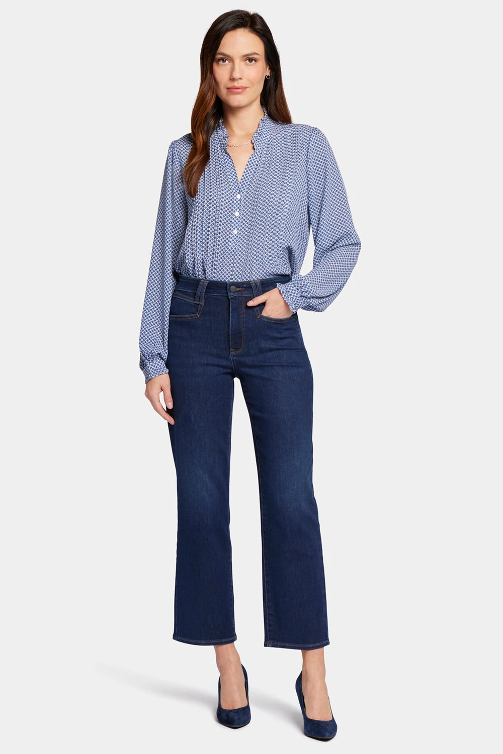 Fun and fashion forward, NYDJ’s Bailey Relaxed Straight Ankle Jeans with High Rise and Square Pockets have a stylish laid-back fit accented by unique square front pockets with flattering seaming detail. A higher rise, combined with a more relaxed fit through the hips and thighs, makes this straight-leg jean the perfect casual-chic option for your wardrobe. Our Lift Tuck® Technology uses a proprietary slimming panel with a patented criss-cross design to shape and support your curves for an always-sleek silhouette. Features four-pocket styling and a zip fly with button closure. Palace is a deep, rich dark wash with soft whiskers and hand sanding that is strongest at the knee area, then fades softly up over the thighs. This jean is made with earth-friendly methods that result in reduced consumption of water, chemicals and/or energy.