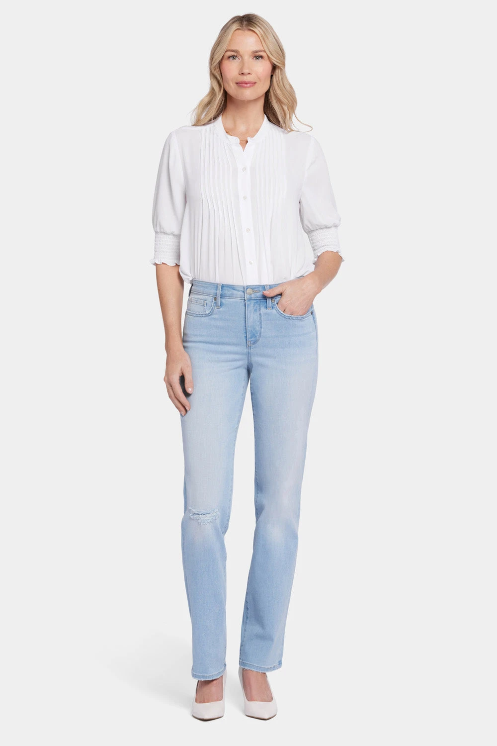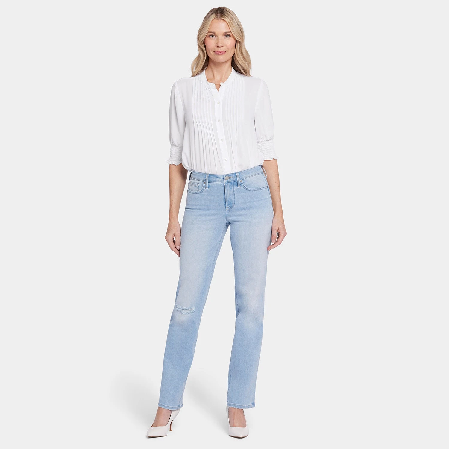 Let’s get straight to the point. The easy, flattering fit of NYDJ’s Bailey Relaxed Straight Jeans with Mid Rise pairs well with everything. This breathable, temperature-regulating denim features COOLMAX® technology to keep you comfortable as the heat rises. Our Lift Tuck® Technology uses a proprietary slimming panel with a patented criss-cross design to shape and support your curves for an always-sleek silhouette. Features five-pocket styling, a zip fly with button closure. Estrella is a vintage-tinted light indigo wash with grindings along the pocket edges and hems, small distressed details on the left hip and knee and a larger distressed detail on the right knee. This jean is made with earth-friendly methods that result in reduced consumption of water, chemicals and/or energy.