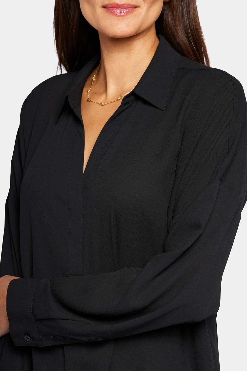 NYDJ’s Becky Blouse is made from georgette with an impeccable drape. This collared pullover style is a true wardrobe essential with fine tailored details and clean-finished with a curved hem. Features a split neckline and dolman sleeves with button cuffs. This blouse’s fabric is made with a sustainable polyester fiber created from 100% post-consumer plastic waste, resulting in less water and energy use and fewer greenhouse gas emissions without changing the look and feel of the fabric. The buttons are made with 50% post-consumer recycled polyester.