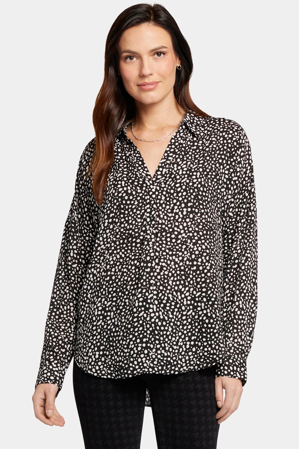 NYDJ’s Becky Blouse is made from georgette with an impeccable drape. This collared pullover style is a true wardrobe essential with fine tailored details and clean-finished with a curved hem. Features a split neckline and dolman sleeves with button cuffs. This blouse’s fabric is made with a sustainable polyester fiber created from 100% post-consumer plastic waste, resulting in less water and energy use and fewer greenhouse gas emissions without changing the look and feel of the fabric. The buttons are made with 50% post-consumer recycled polyester.