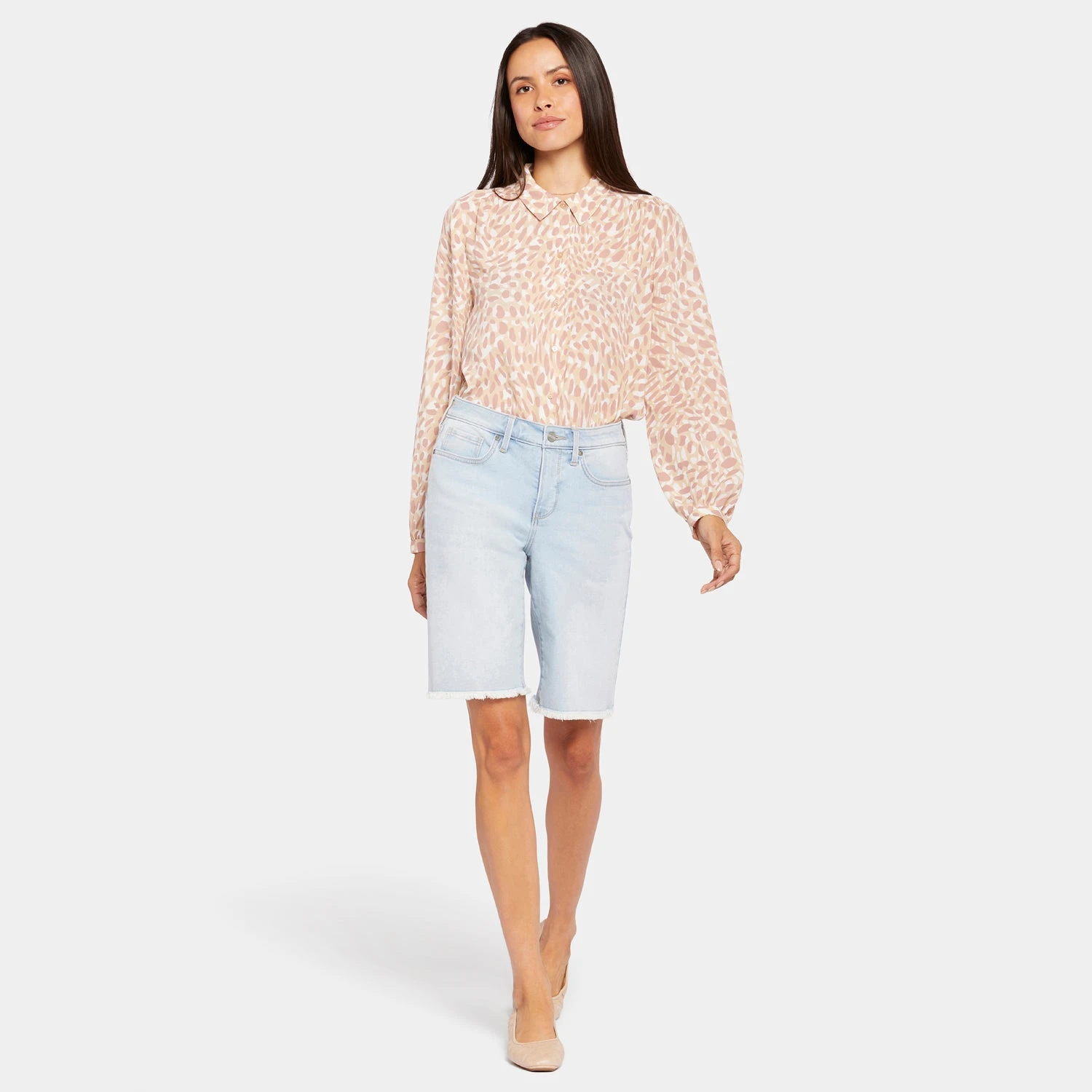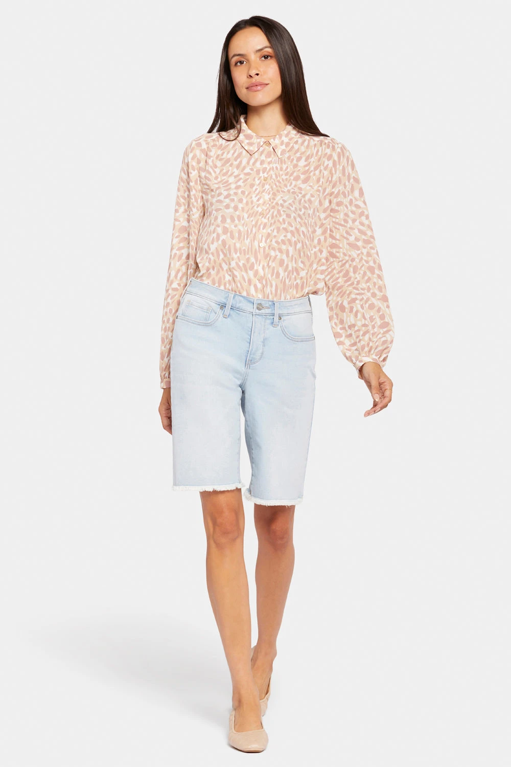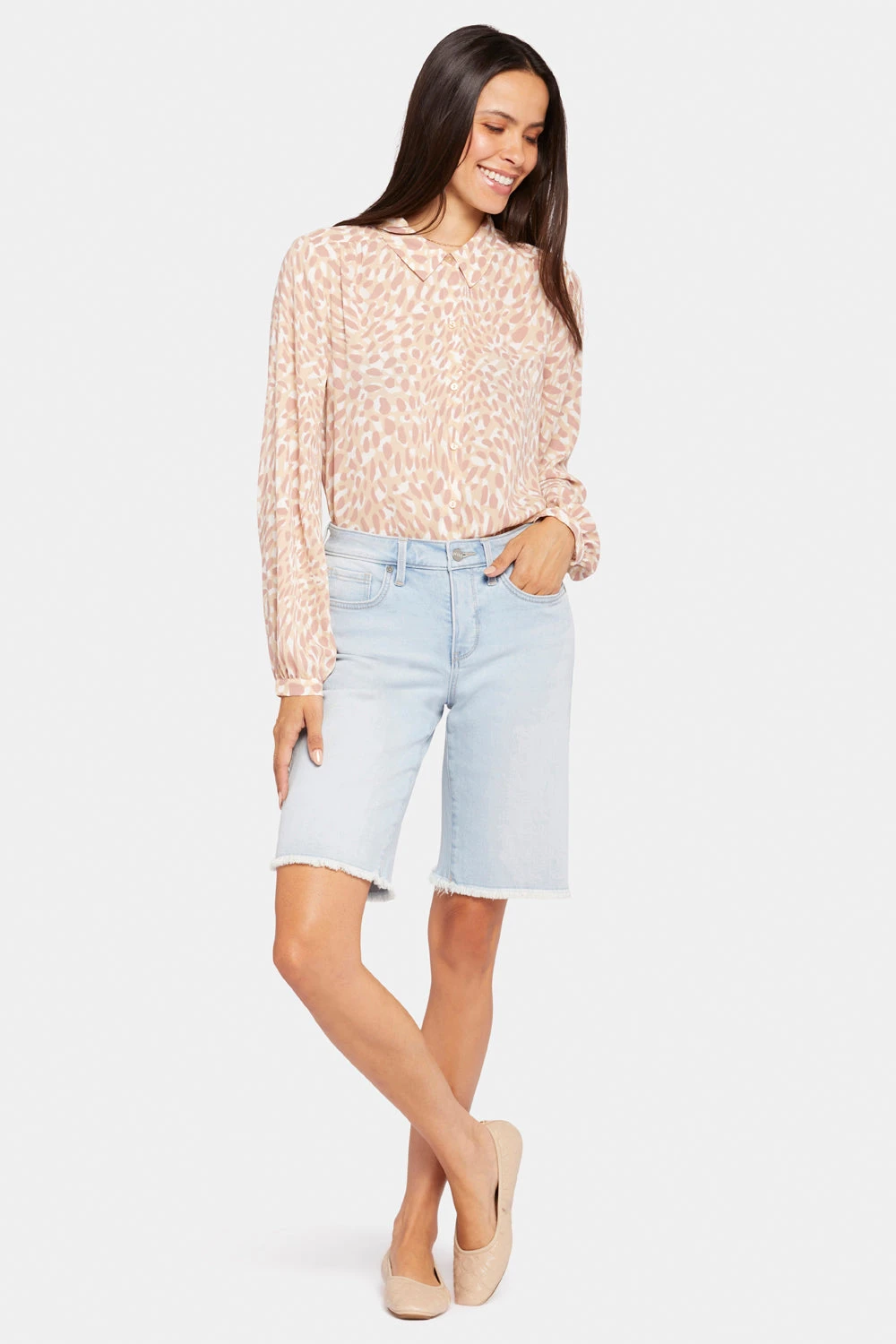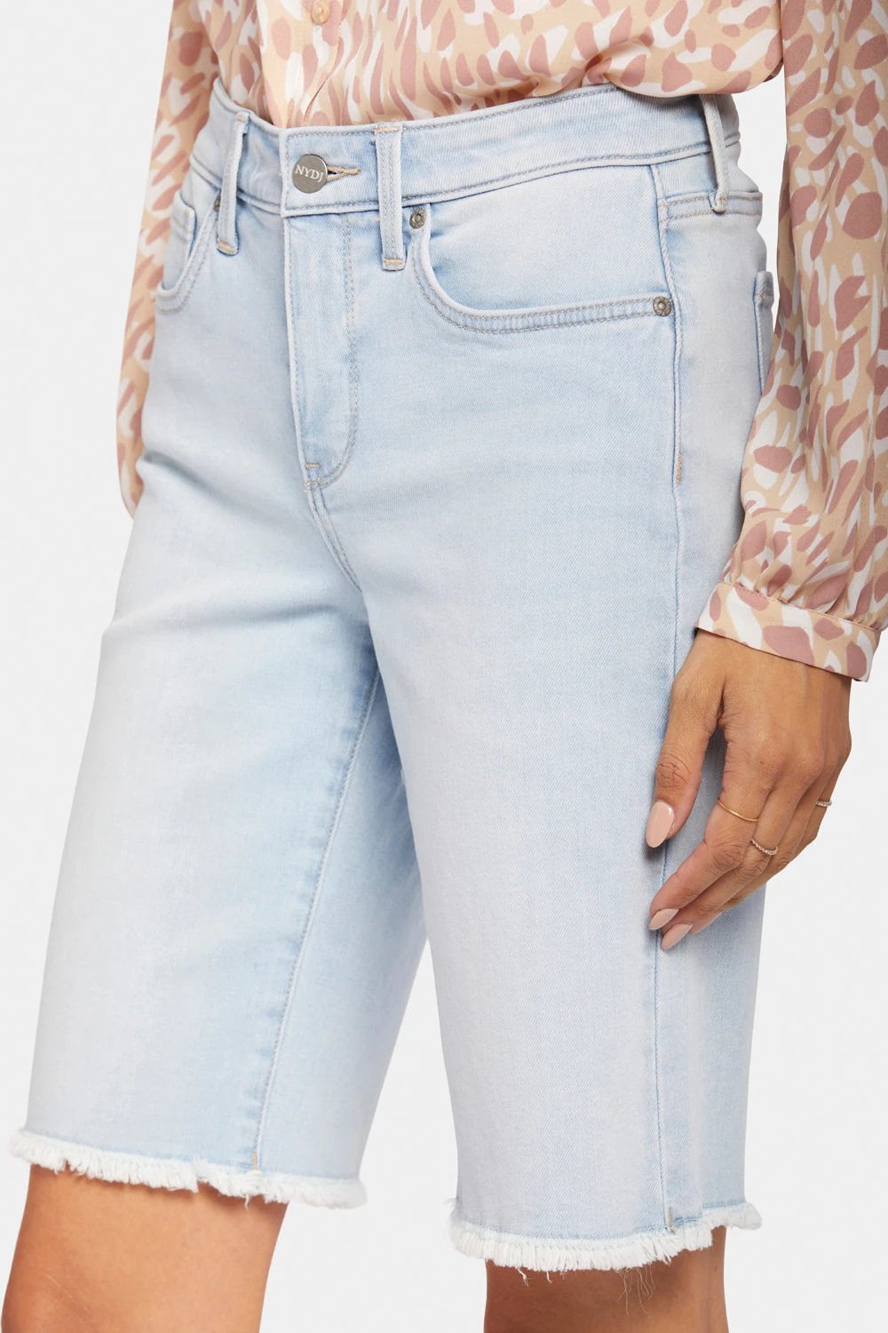 Play it cool and casual in the Boyfriend Denim Shorts with Frayed Hems by NYDJ. This five-pocket pair has a relaxed longer fit designed to hit just above the knee. Our Lift Tuck® Technology uses a slimming panel with a criss-cross design to shape curves. Features a zip fly, button waist and frayed hems. Our Quinta wash features light distressing on the front and back pocket edges as well as a pebbled treatment that results in a slightly unique look for each short. Brightside is a light wash with plenty of vintage character.