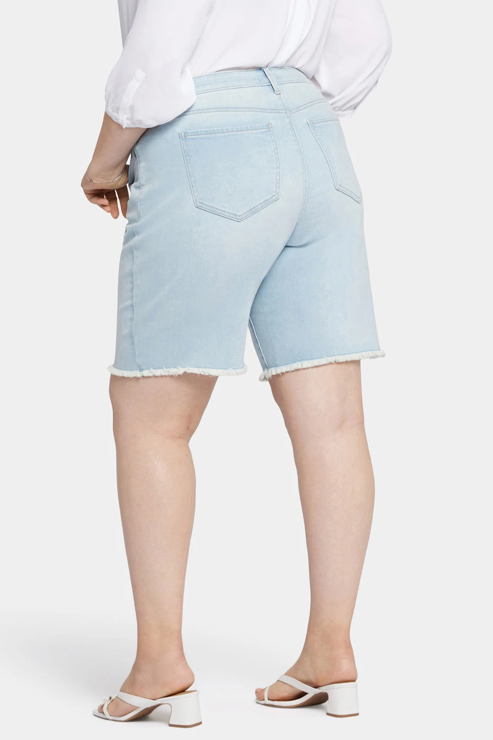 Play it cool and casual in the Boyfriend Denim Shorts in Plus Size with Frayed Hems by NYDJ. This five-pocket pair has a relaxed longer fit designed to hit just above the knee. Our Lift Tuck® Technology uses a slimming panel with a criss-cross design to shape curves. Features a zip fly, button waist and frayed hems. Our Quinta wash features light distressing on the front and back pocket edges as well as a pebbled treatment that results in a slightly unique look for each short. Brightside is a light wash with plenty of vintage character.