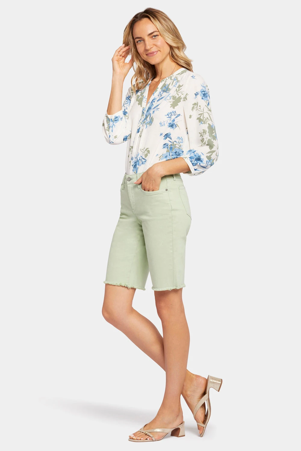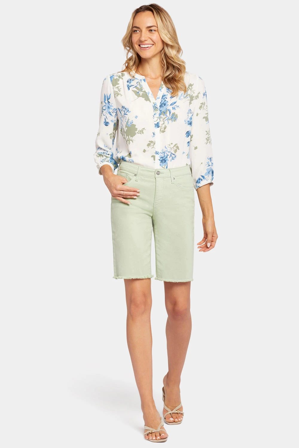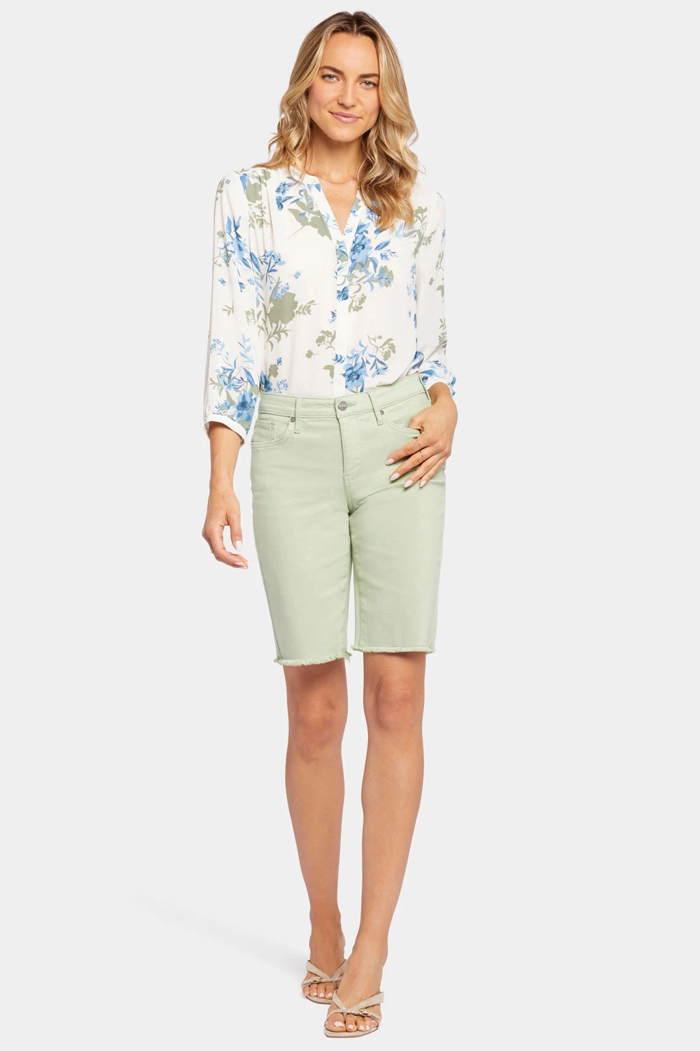 Play it cool and casual in the Boyfriend Shorts with Frayed Hems by NYDJ. This five-pocket pair has a relaxed longer fit designed to hit just above the knee. Our Lift Tuck® Technology uses a slimming panel with a criss-cross design to shape curves. Features a zip fly, button waist and frayed hems. These shorts are made with earth-friendly methods that result in reduced consumption of water, chemicals and/or energy.