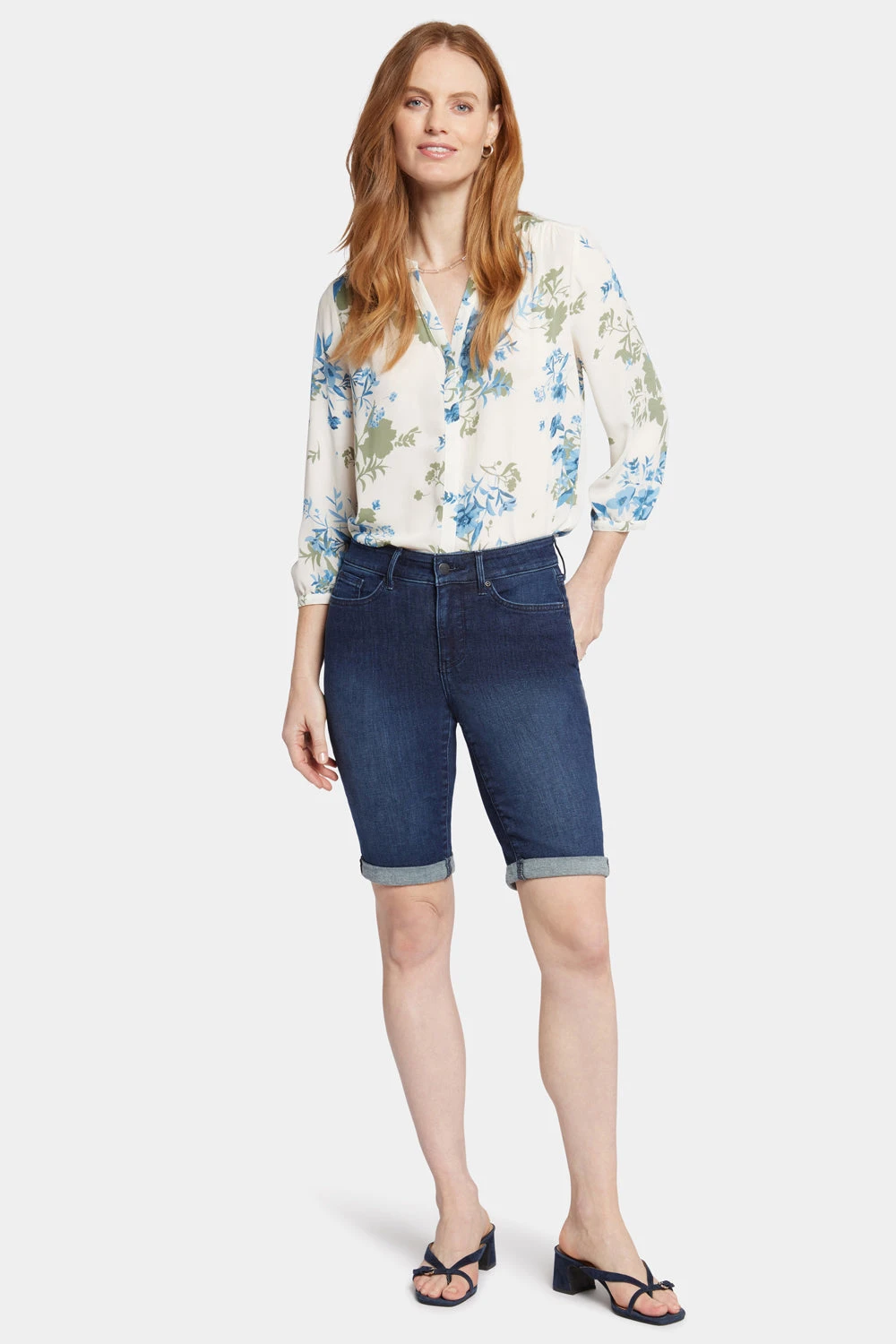 Bask in the sunshine and the sure-to-be-coming compliments in NYDJ’s Briella 11 Inch Denim Shorts with Roll Cuffs. A longer inseam gives you just the right amount of comfort and coverage for active days, while the rolled cuff offers a touch of polish. This slimming short features our signature Lift Tuck® Technology. Finished with classic five-pocket styling, zip fly and button closure. Dimension is a dark indigo wash featuring light whiskering on the front hips and gentle sanding on the thighs and seat. Mesmerize is a medium wash with a slight vintage tint, whiskering on the front hips and gentle hand sanding on the front pocket scoops, thighs, knees and seat. Promise is a light indigo stone wash with classic vintage character. This short is made with earth-friendly methods that result in reduced consumption of water, chemicals and/or energy and with a sustainable polyester fiber created from 100% post-consumer plastic waste, resulting in less water and energy use and fewer greenhouse gas emissions without changing the look and feel of the fabric.Â