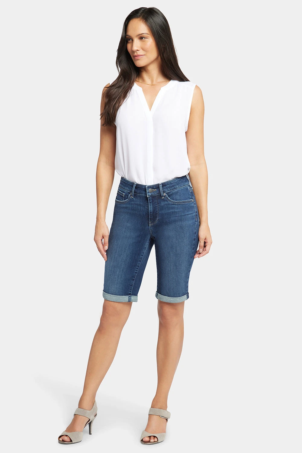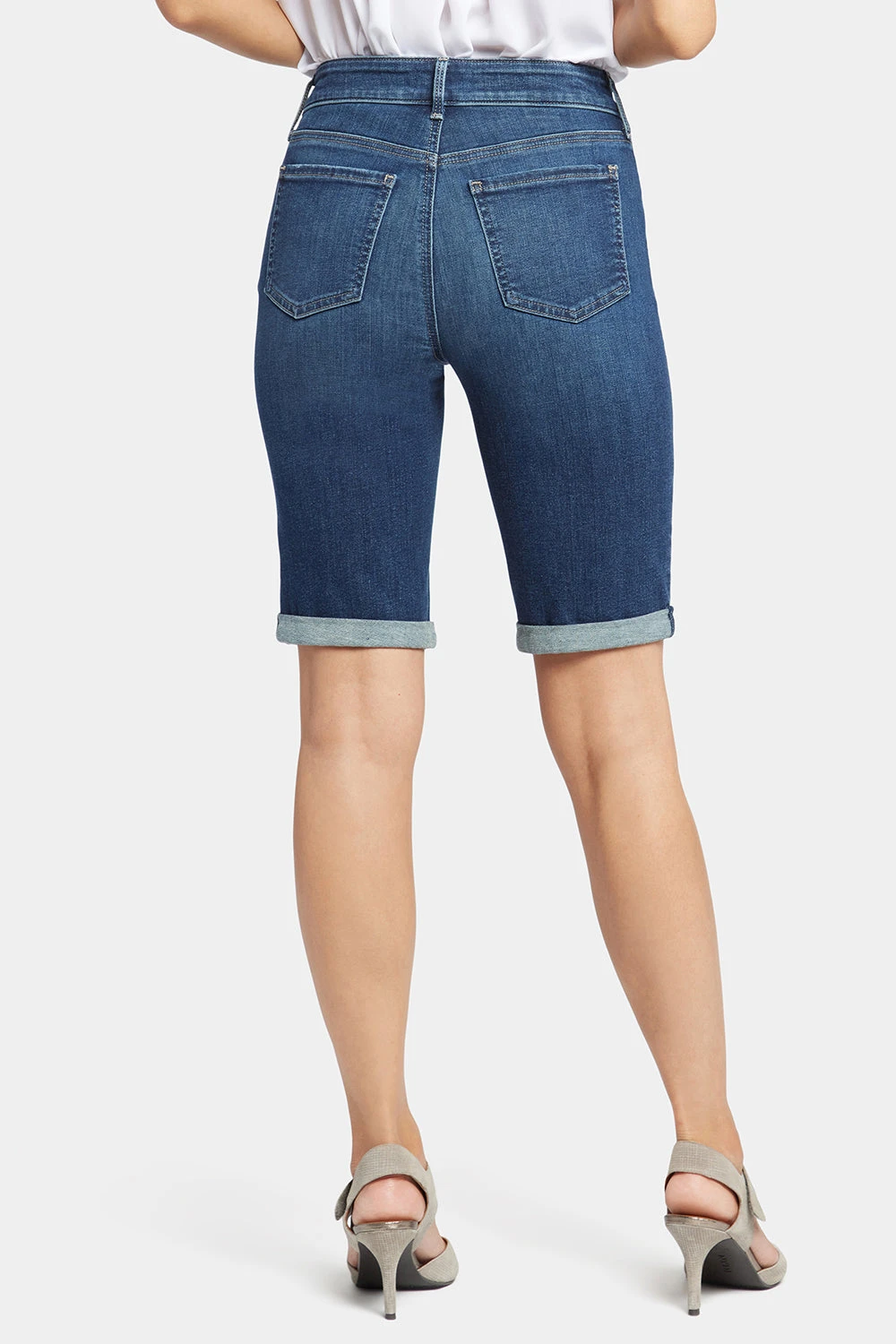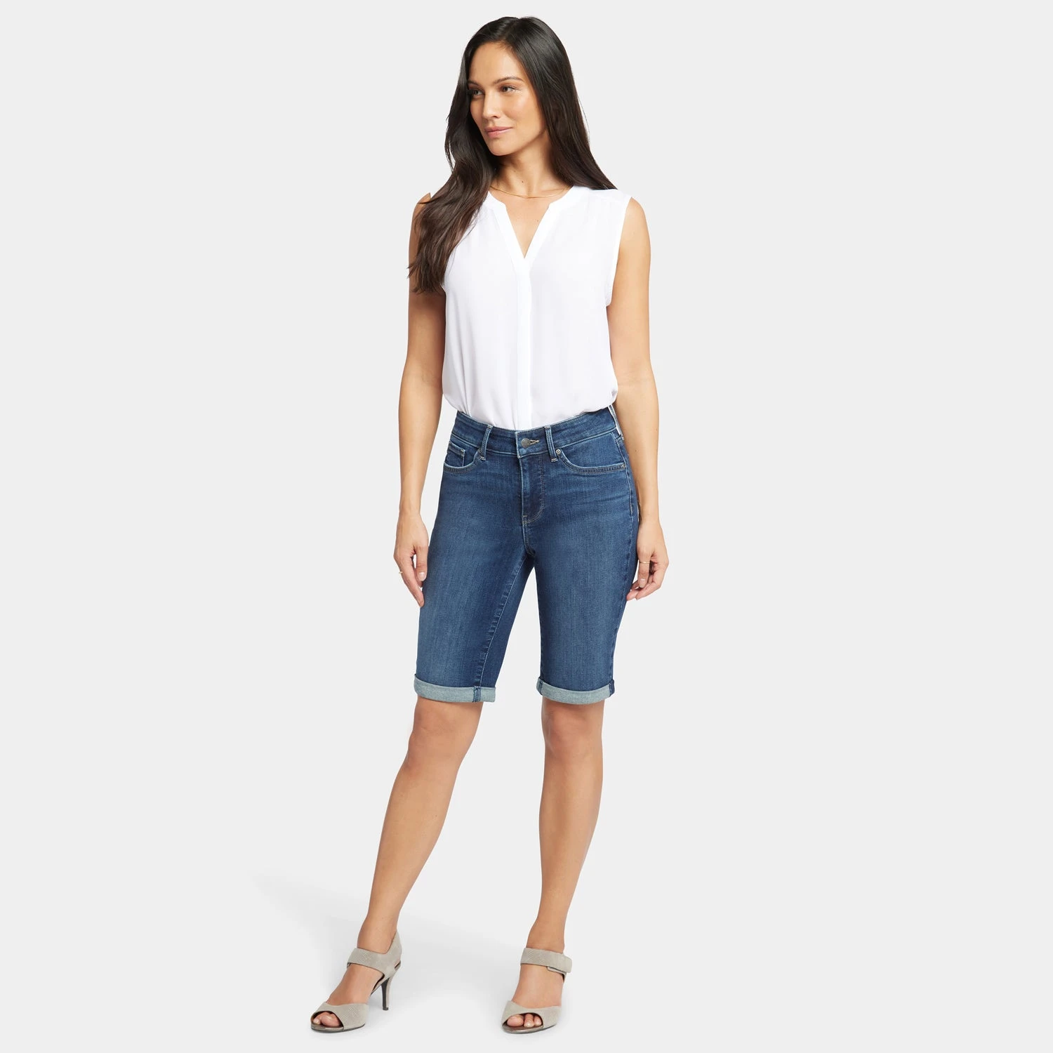 Bask in the sunshine and the sure-to-be-coming compliments in NYDJ’s Briella 11 Inch Denim Shorts with Roll Cuffs. A longer inseam gives you just the right amount of comfort and coverage for active days, while the rolled cuff offers a touch of polish. This slimming short features our signature Lift Tuck® Technology. Finished with classic five-pocket styling, zip fly and button closure. Dimension is a dark indigo wash featuring light whiskering on the front hips and gentle sanding on the thighs and seat. Mesmerize is a medium wash with a slight vintage tint, whiskering on the front hips and gentle hand sanding on the front pocket scoops, thighs, knees and seat. Promise is a light indigo stone wash with classic vintage character. This short is made with earth-friendly methods that result in reduced consumption of water, chemicals and/or energy and with a sustainable polyester fiber created from 100% post-consumer plastic waste, resulting in less water and energy use and fewer greenhouse gas emissions without changing the look and feel of the fabric.Â