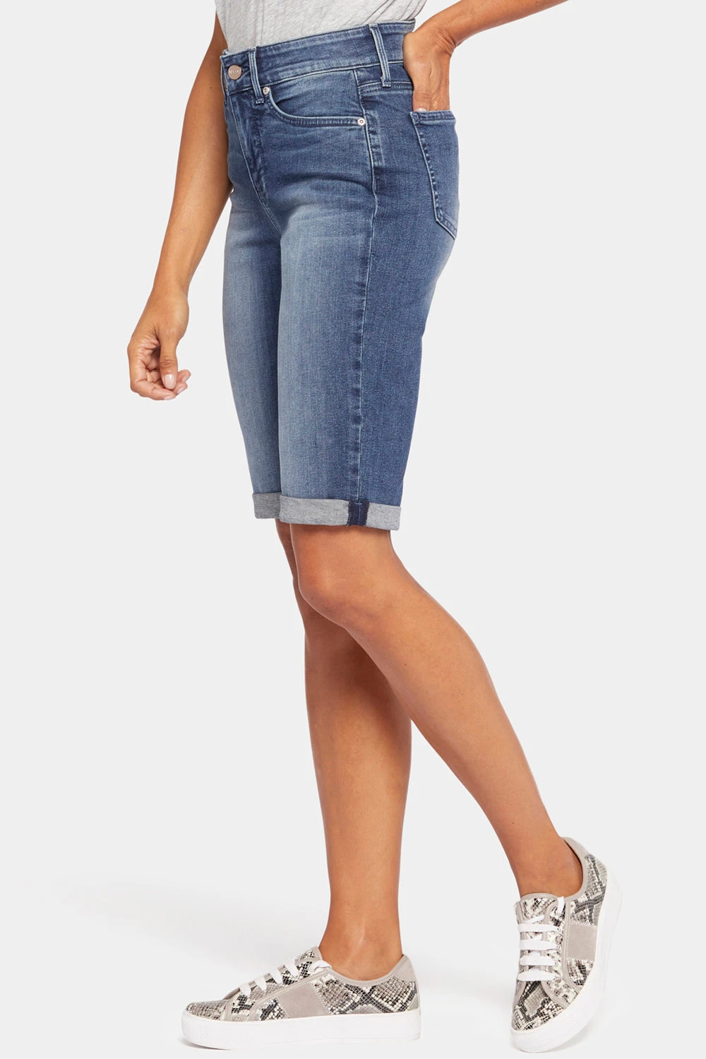Bask in the sunshine and the sure-to-be-coming compliments in NYDJ’s Briella 11 Inch Denim Shorts with Roll Cuffs. A longer inseam gives you just the right amount of comfort and coverage for active days, while the rolled cuff offers a touch of polish. This slimming short features our signature Lift Tuck® Technology. Finished with classic five-pocket styling, zip fly and button closure. This short is made with earth-friendly methods that result in reduced consumption of water, chemicals and/or energy.
