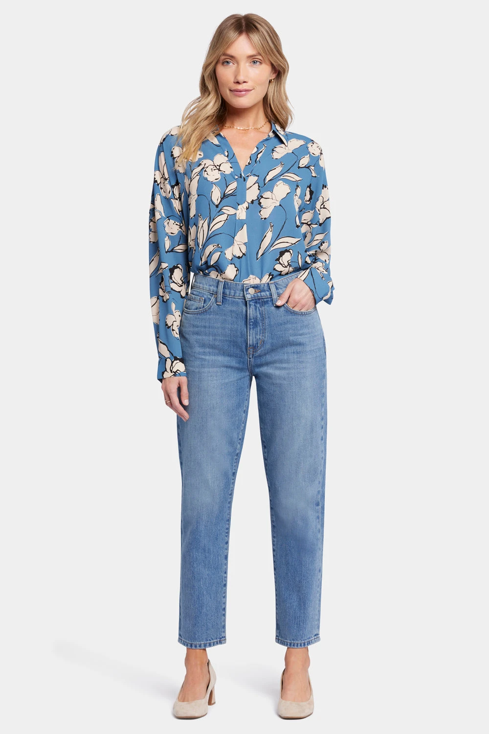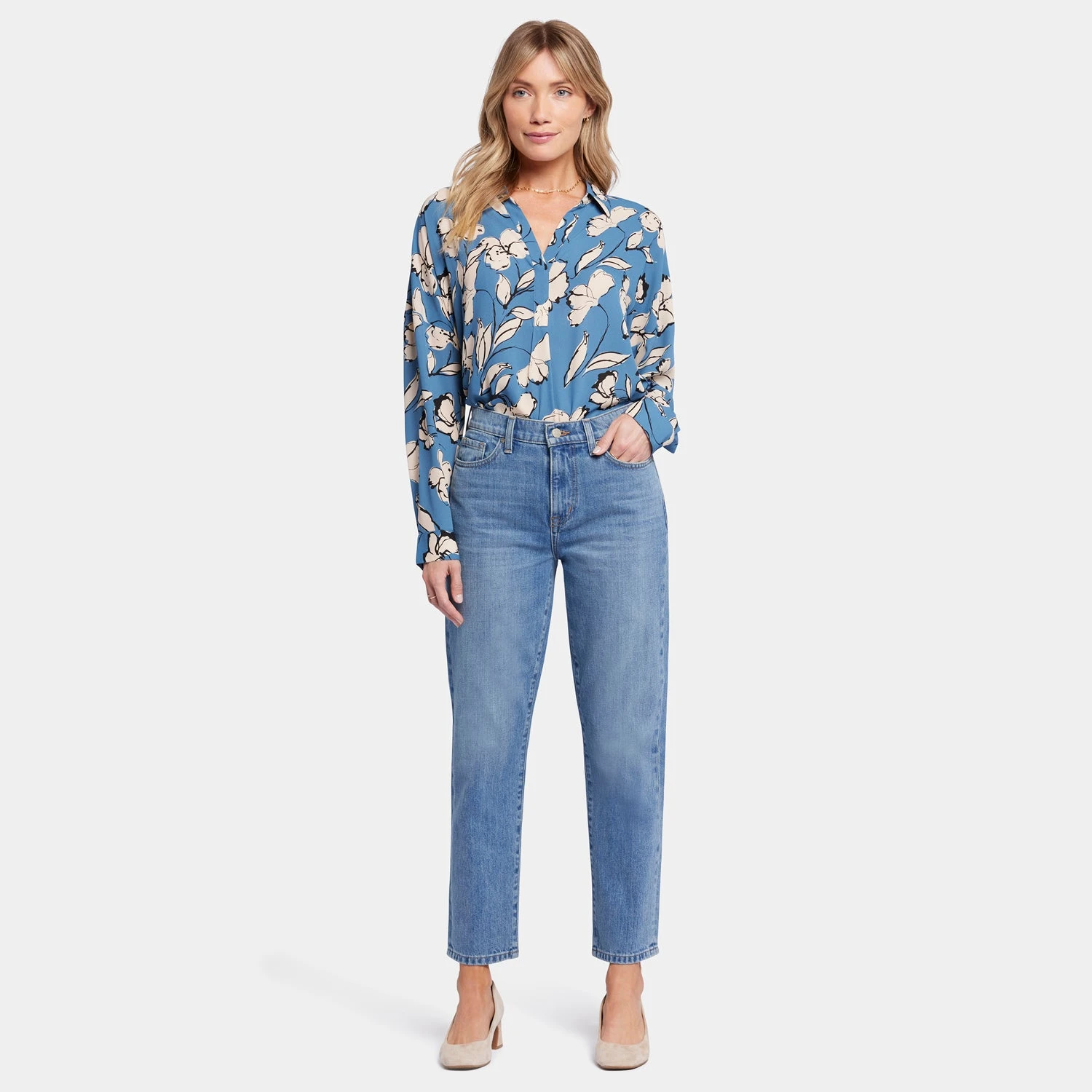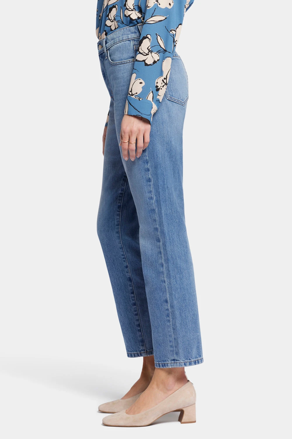The flattering, easy fit of NYDJ’s Charlotte Relaxed Jeans in Rigid Denim with Super High Rise pairs well with everything. Vintage-inspired rigid denim, a higher waist, a relaxed hip and thigh and an ankle-grazing length make this jean the perfect casual-chic option for your wardrobe. Features classic five-pocket styling and zip fly with button closure. Piccadilly is a bright medium stone wash with whiskers, hand sanding and an allover pebbled effect. Please reference waist sizing in the NYDJ size guide.