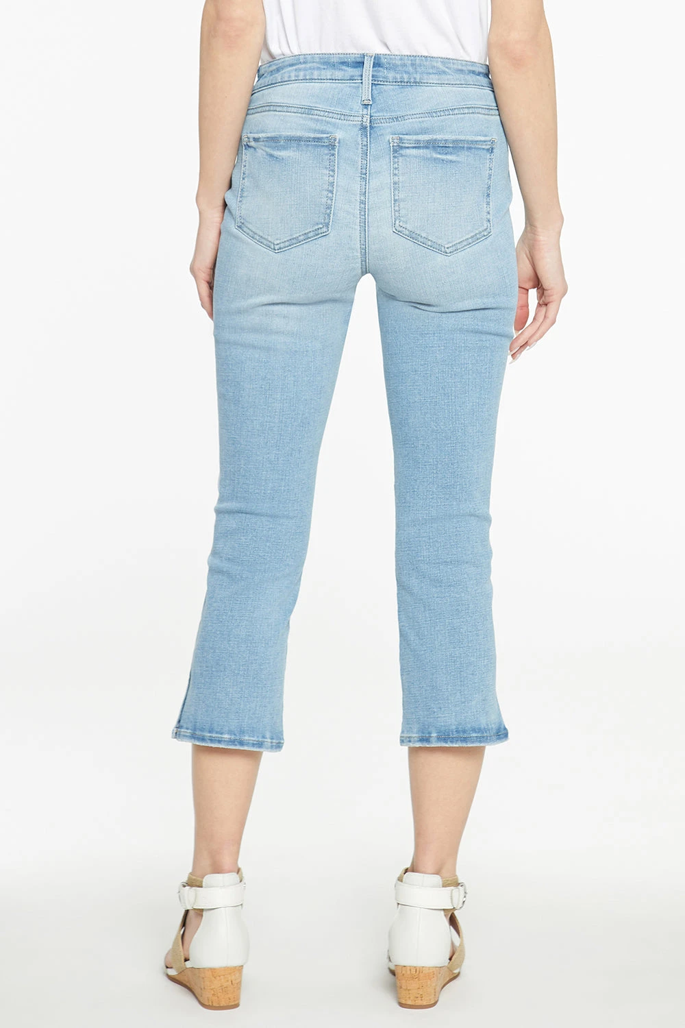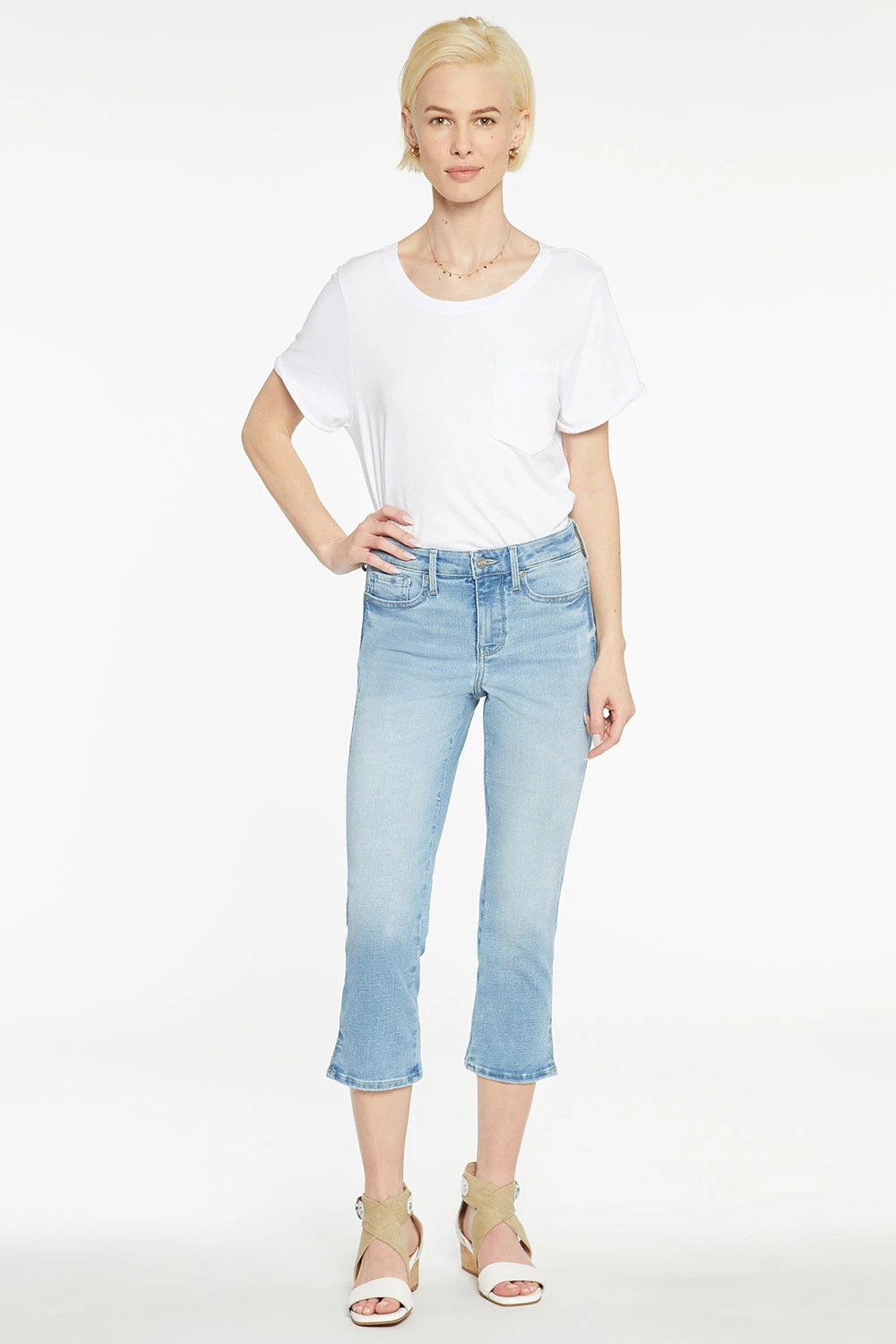 No closet is complete without the Chloe Capri Jeans by NYDJ. A slightly cropped length is the perfect complement to a trim-looking silhouette that flatters from every angle. NYDJ’s signature Lift Tuck® Technology uses a proprietary slimming panel with a patented criss-cross design to give a smoother appearance. Features classic five-pocket styling, a zip fly with button closure and side slits at the hems. Our Easley wash features light distressing on the front and back pocket edges, below the front left pocket, on the upper left front leg and on the hems. This jean is made with earth-friendly methods that result in reduced consumption of water, chemicals and/or energy.