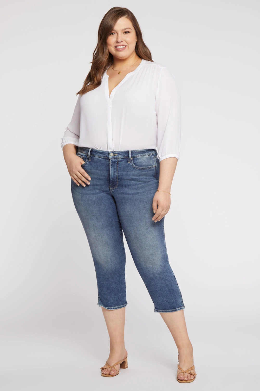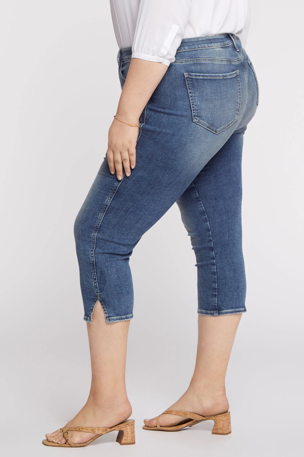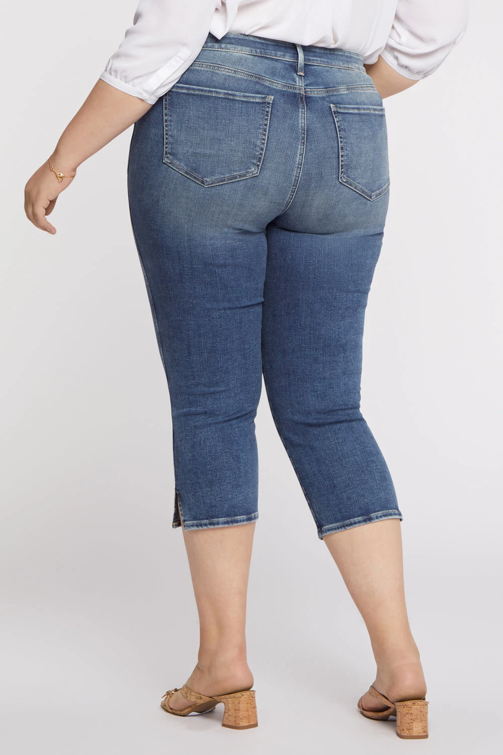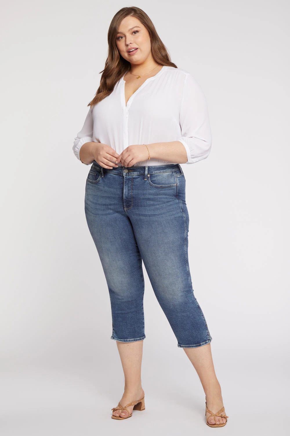 No closet is complete without the Chloe Capri Jeans by NYDJ. A slightly cropped length is the perfect complement to a trim-looking silhouette that flatters from every angle. NYDJ’s signature Lift Tuck® Technology uses a proprietary slimming panel with a patented criss-cross design to give a smoother appearance. Features classic five-pocket styling, a zip fly with button closure and side slits at the hems. Loire is a medium light indigo wash featuring a vintage tint, strong whiskering on the front hips and sanding on the front thighs and seat. This jean is made with earth-friendly methods that result in reduced consumption of water, chemicals and/or energy.