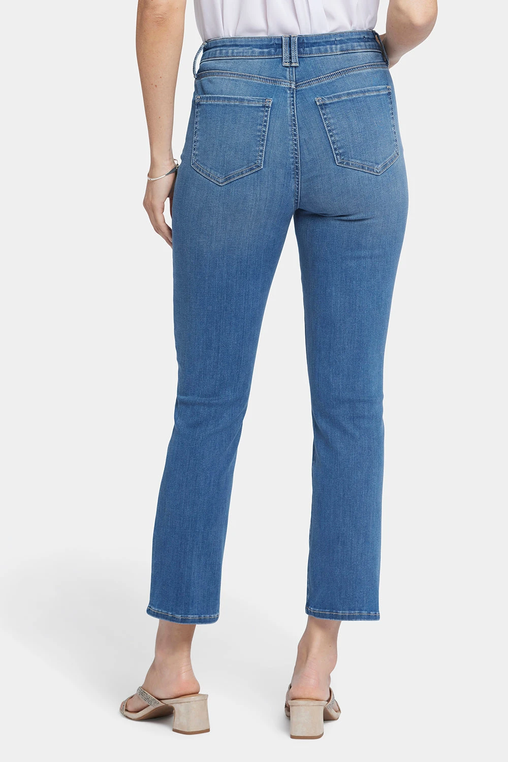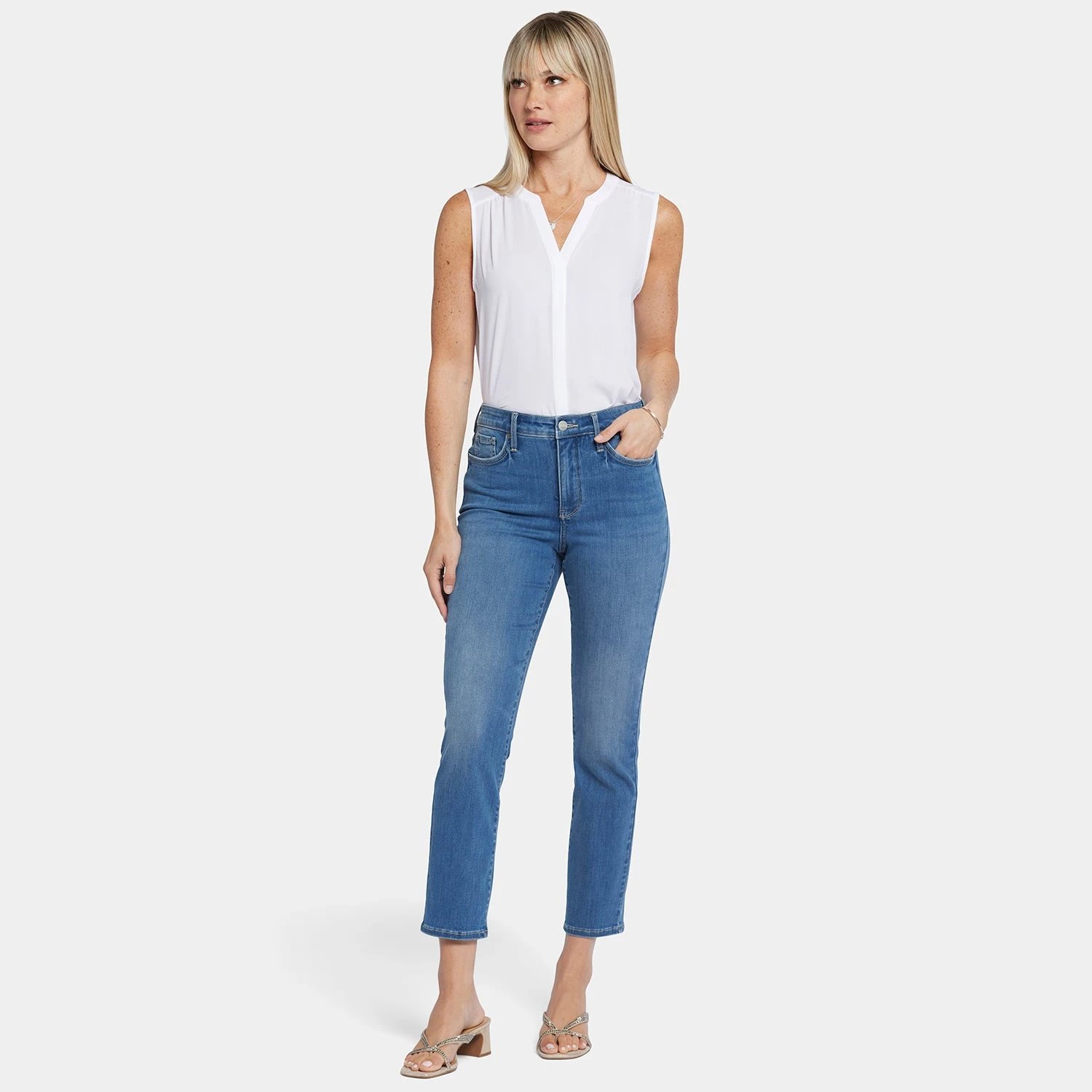 NYDJ’s Curve Shaper™ Sheri Slim Ankle Jeans with High Rise are designed to sculpt and lift curves using an innovative back sweetheart yoke with an internal mesh compression panel and higher pocket placement. These slim-fit jeans provide support in all the right places thanks to ultra-comfortable stretch denim that naturally molds to you and a high rise that enhances their hourglass silhouette. The design includes our Lift Tuck® Technology, which uses a proprietary slimming panel to flatten in front. Features classic five-pocket styling, zip fly and button closure. Blue Water is a medium-light blue wash with tucks on the waist and pocket scoops, whiskering on the front hips and fading on the front thighs and seat. This jean is made with earth-friendly methods that result in reduced consumption of water, chemicals and/or energy.