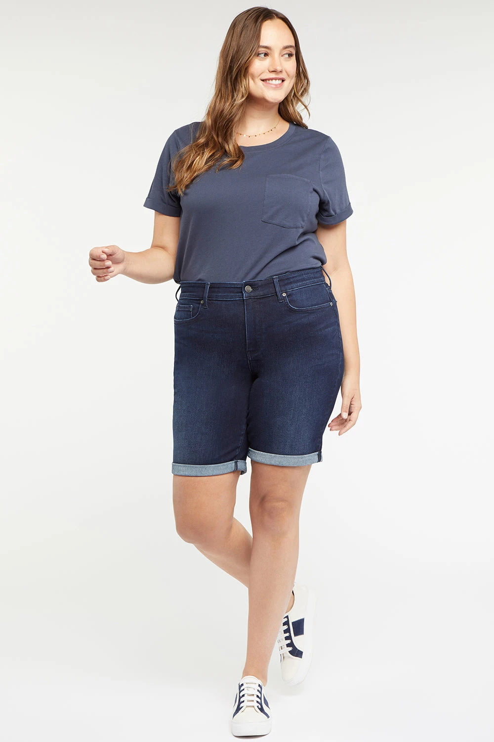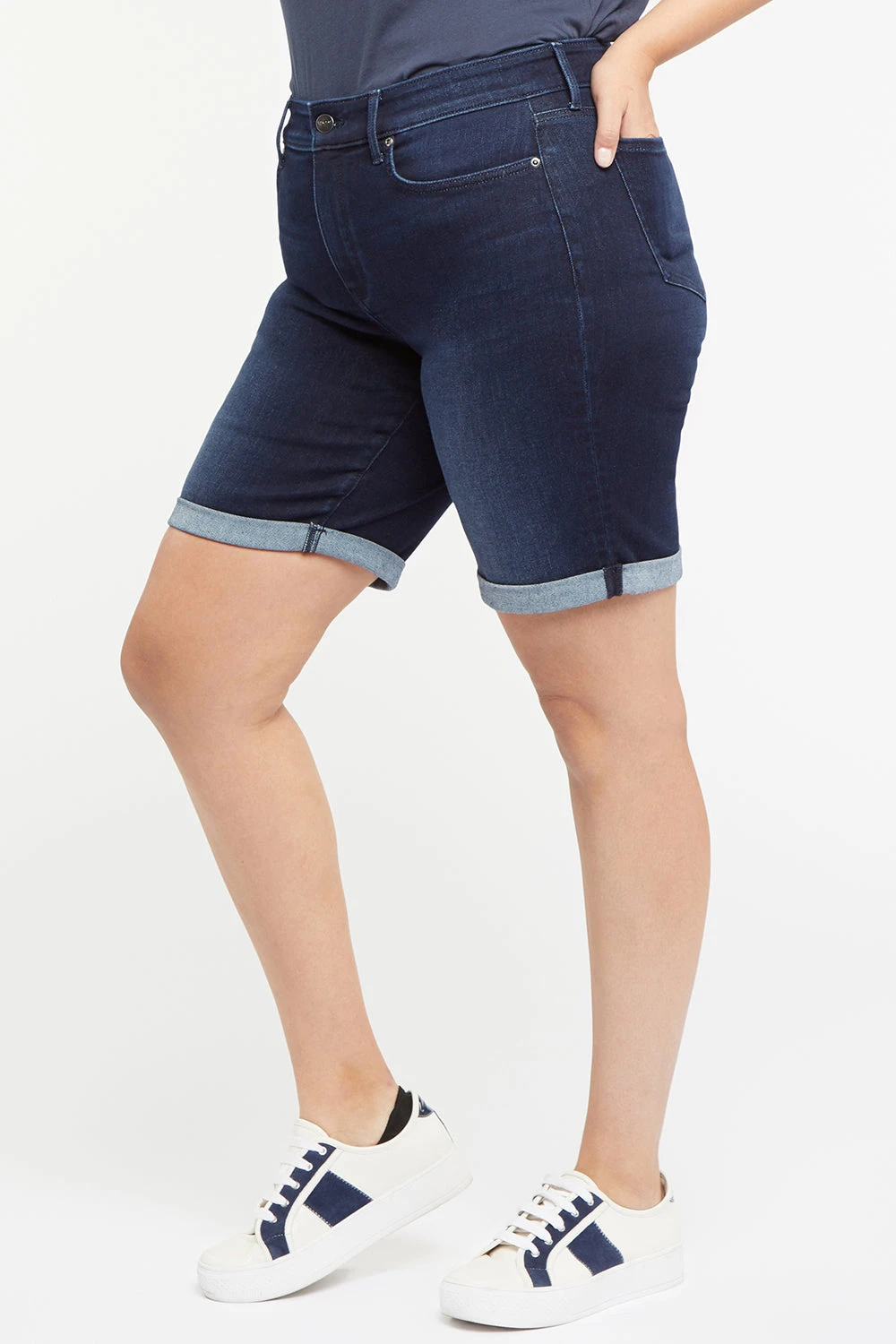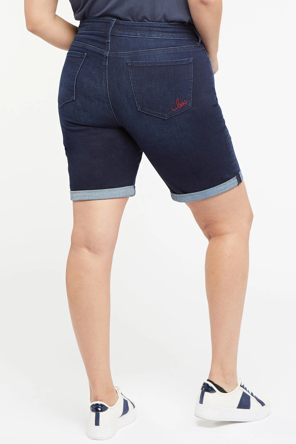 Keep your hemlines short and your days long! NYDJ’s Ella Denim Shorts in Plus Size with Roll Cuffs and Love Embroidery are that perfect short you didn’t even know you were searching for, but now you can’t live without. Wear them through all the hottest days and nights and let the compliments roll in. Our Lift Tuck® Technology uses a proprietary slimming panel with a patented criss-cross design to shape and support your curves. Finished with classic five-pocket styling, a zip fly with button closure, adjustable roll cuffs and embroidered “love” script on one back pocket.