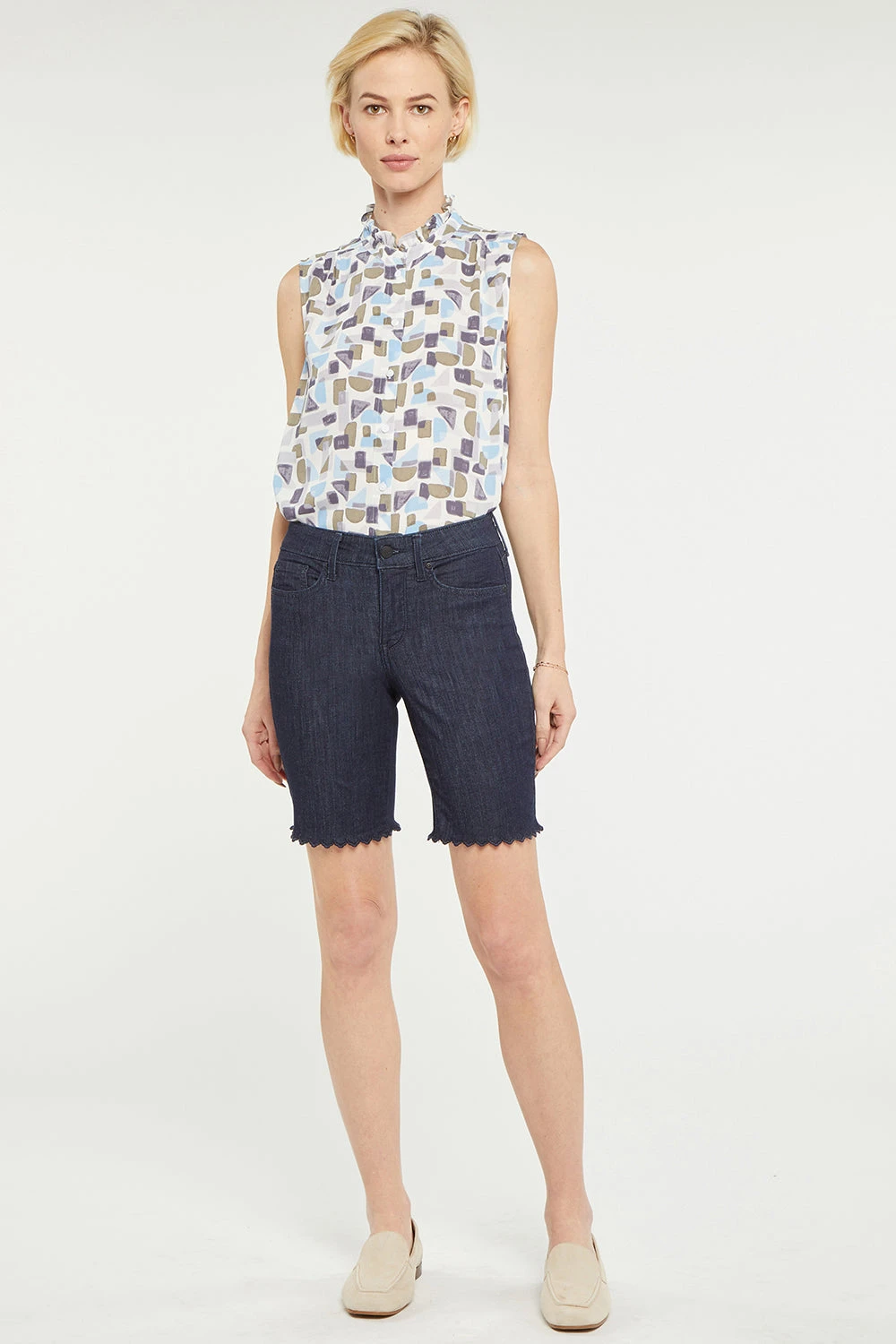 A summer must-have with some extra style, NYDJ’s Ella Denim Shorts with Scallop Hems are just the right length and have just enough unique detail in their chic hems trimmed by scallop embroidery. Wear them through all the hottest days and nights and let the compliments roll in. Our Lift Tuck® Technology uses a proprietary slimming panel with a patented criss-cross design to shape and support your curves. Features classic five-pocket styling and a zip fly with button closure. Soft lightweight denim provides a comfortable, breezy feel. This short is made with earth-friendly methods that result in reduced consumption of water, chemicals and/or energy.
