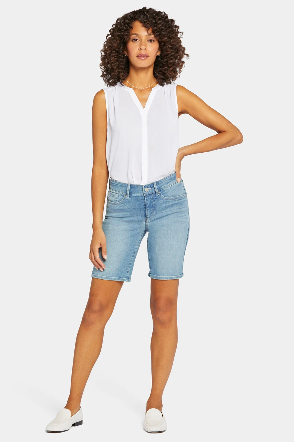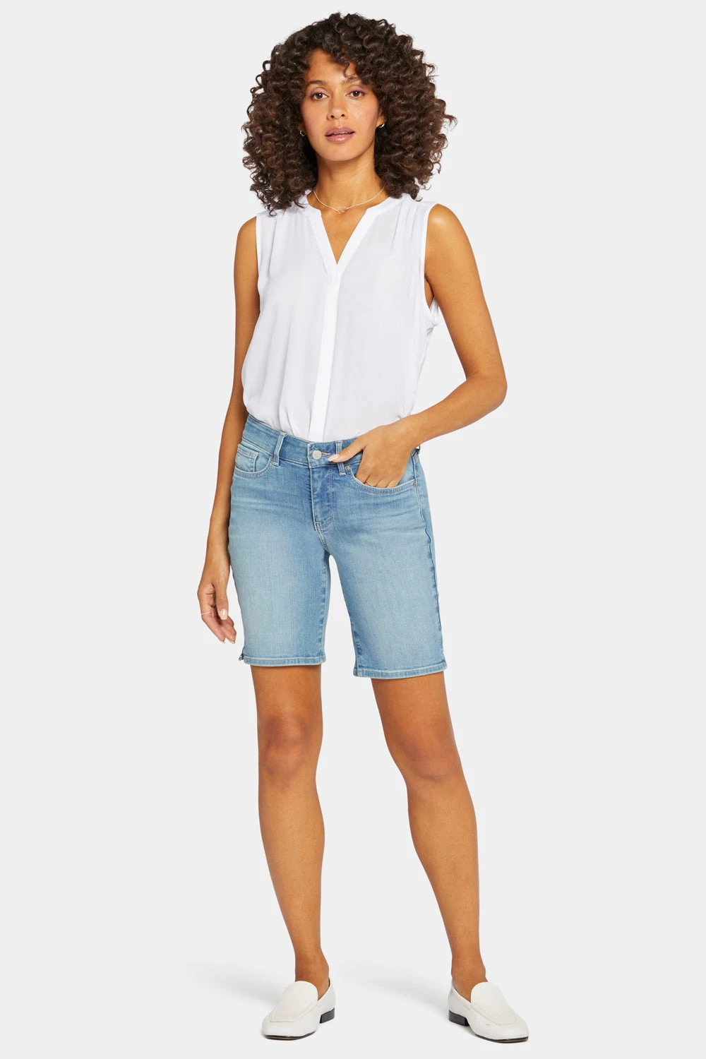 Keep your hemlines short and your days long! NYDJ’s Ella Denim Shorts with Side Slits are that perfect short you didn’t even know you were searching for, but now you can’t live without. Wear them through all the hottest days and nights and let the compliments roll in. Our Lift Tuck® Technology uses a proprietary slimming panel with a patented criss-cross design to shape and support your curves. Finished with classic five-pocket styling, a zip and button fly and side slits at the hem. Mesmerize is a medium wash with a slight vintage tint, whiskering on the front hips and gentle hand sanding on the front pocket scoops, thighs, knees and seat. This short is made with a sustainable polyester fiber created from 100% post-consumer plastic waste, resulting in less water and energy use and fewer greenhouse gas emissions without changing the look and feel of the fabric.
