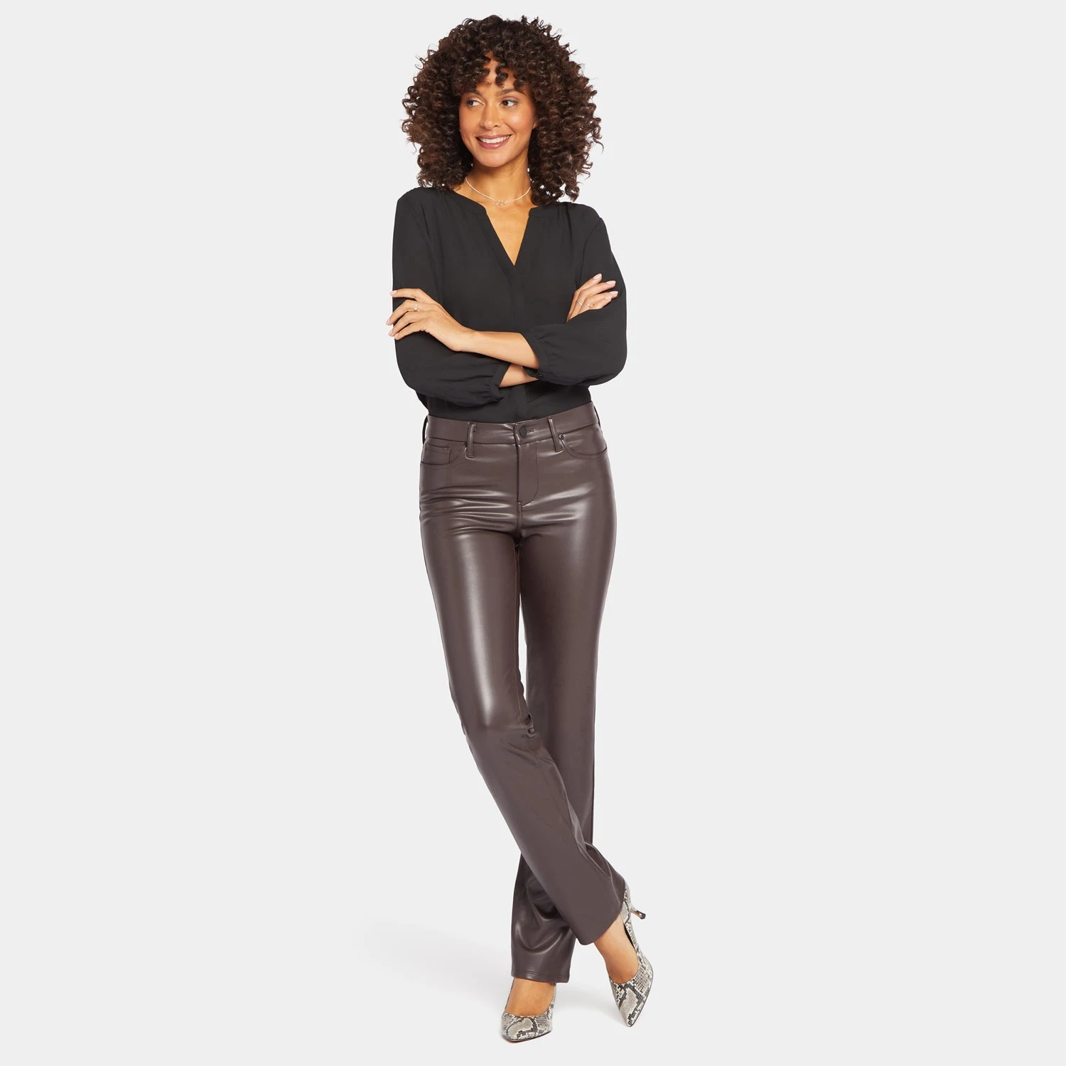 Our most popular silhouette, now in super-sculpting compression faux leather. NYDJ’s Faux Leather Marilyn Straight Pants in Petite have a flattering and versatile straight-leg fit that elongates the figure, while their texture adds a bold edge to outfits. Lift Tuck® Technology uses a proprietary slimming panel with a patented criss-cross design to shape and support your curves for even more sleekness. The styling of this pair is finished with five pockets and a zip fly with button closure. These pants are part of Sculpt-Herâ„¢, NYDJ’s most novel collection of compression-contouring silhouettes with an unparalleled, cutting-edge fit.