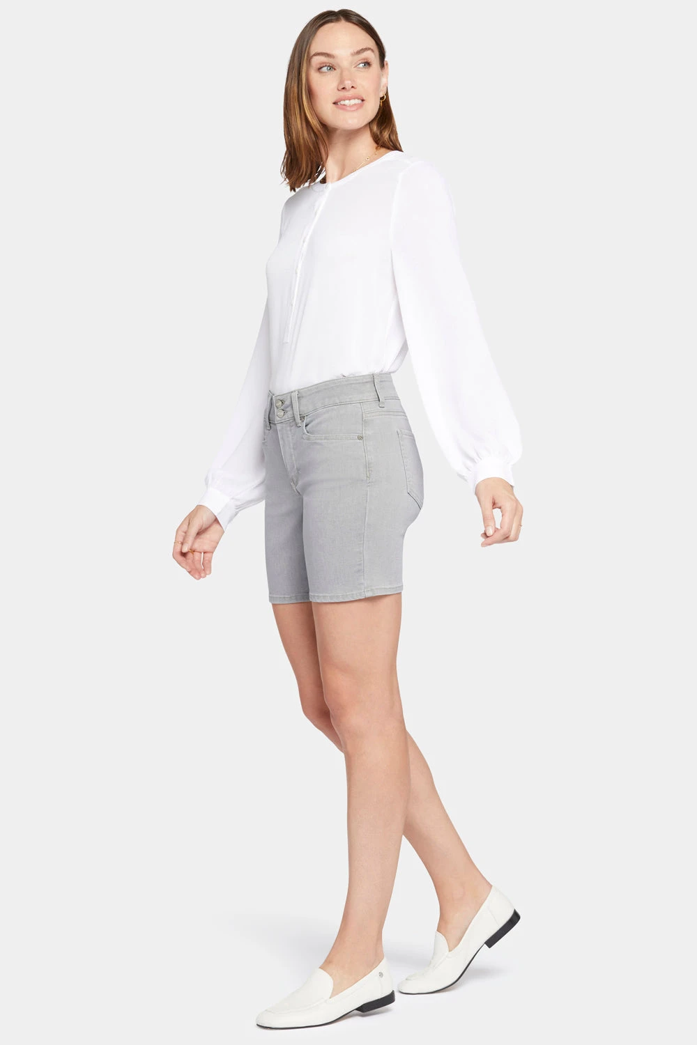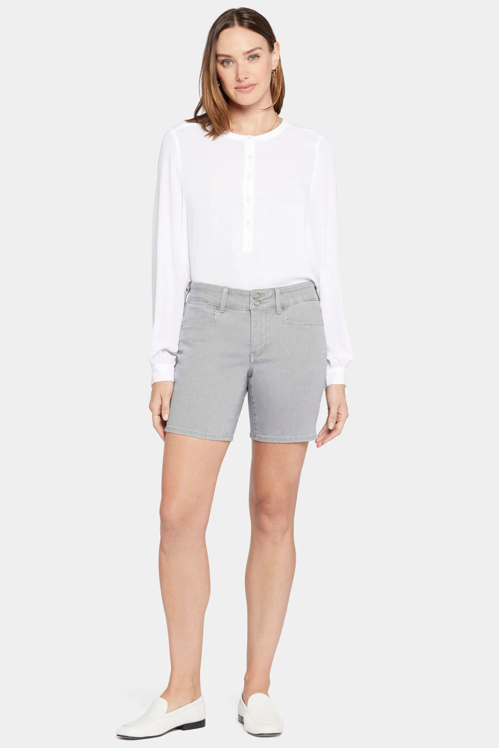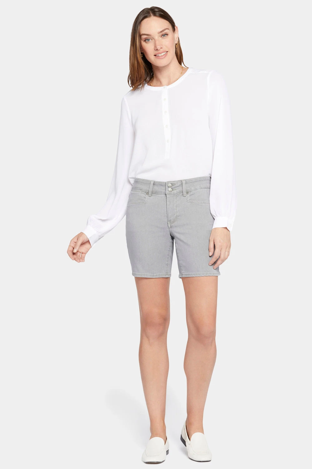 NYDJ’s Frankie Relaxed Shorts with Wide Waistband and Squared Pockets have a breezy look and feel that flatters curves. A high, wide waistband cinches their silhouette as our signature Lift Tuck® Technology that smooths the fit in front. Finished with four-pocket styling and a zip fly with a double button closure.Â
