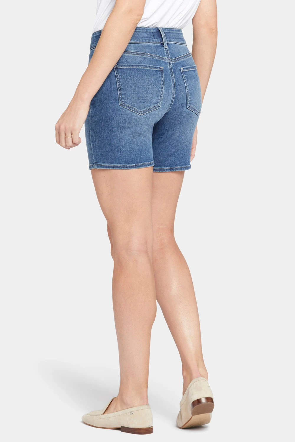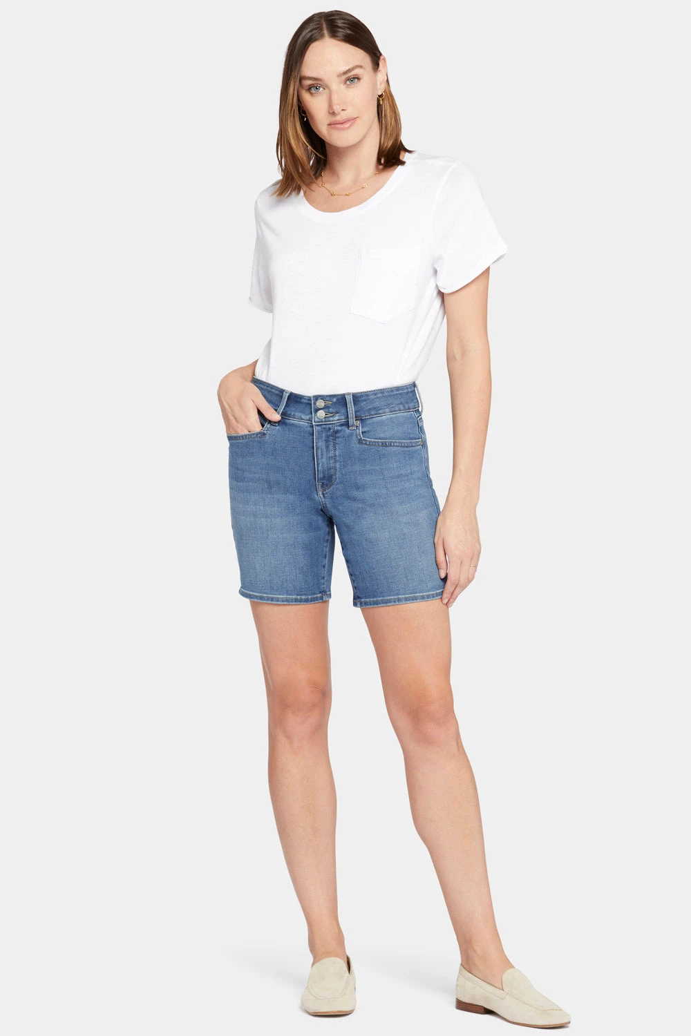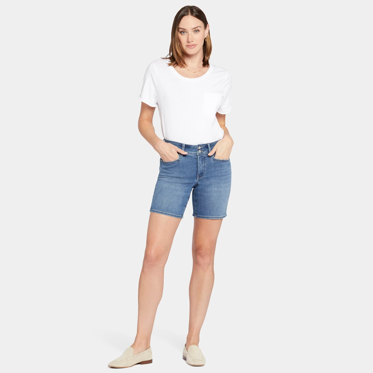 NYDJ’s Frankie Relaxed Shorts in Petite with Wide Waistband and Square Pockets have a breezy look and feel that flatters curves. A high, wide waistband cinches their silhouette as our signature Lift Tuck® Technology smooths the fit in front. Finished with five-pocket styling and a zip fly with a double-button closure. Awakening is a medium-dark wash with soft whiskers on the front hips and hand sanding throughout. This short is made with earth-friendly methods that result in reduced consumption of water, chemicals and/or energy.
