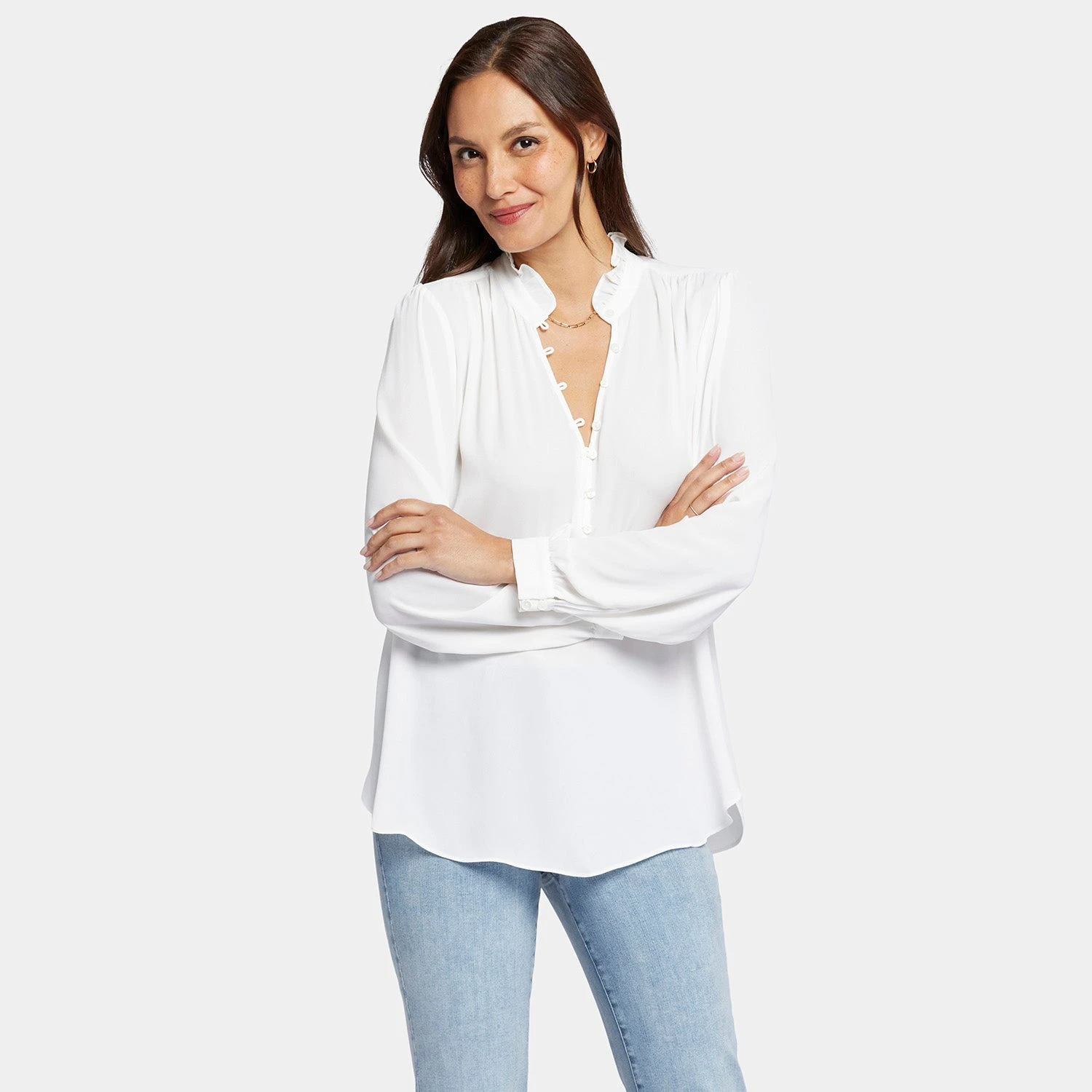 NYDJ’s Hannah Blouse adds an elegant touch to any look. Blouson sleeves with button cuffs provide airy appeal, while soft gathers add volume throughout. Detailed with a ruffled stand collar and front button placket. This blouse is made with a sustainable polyester fiber created from 100% post-consumer plastic waste, resulting in less water and energy use and fewer greenhouse gas emissions without changing the look and feel of the fabric. The buttons are made with 50% post-consumer recycled polyester.