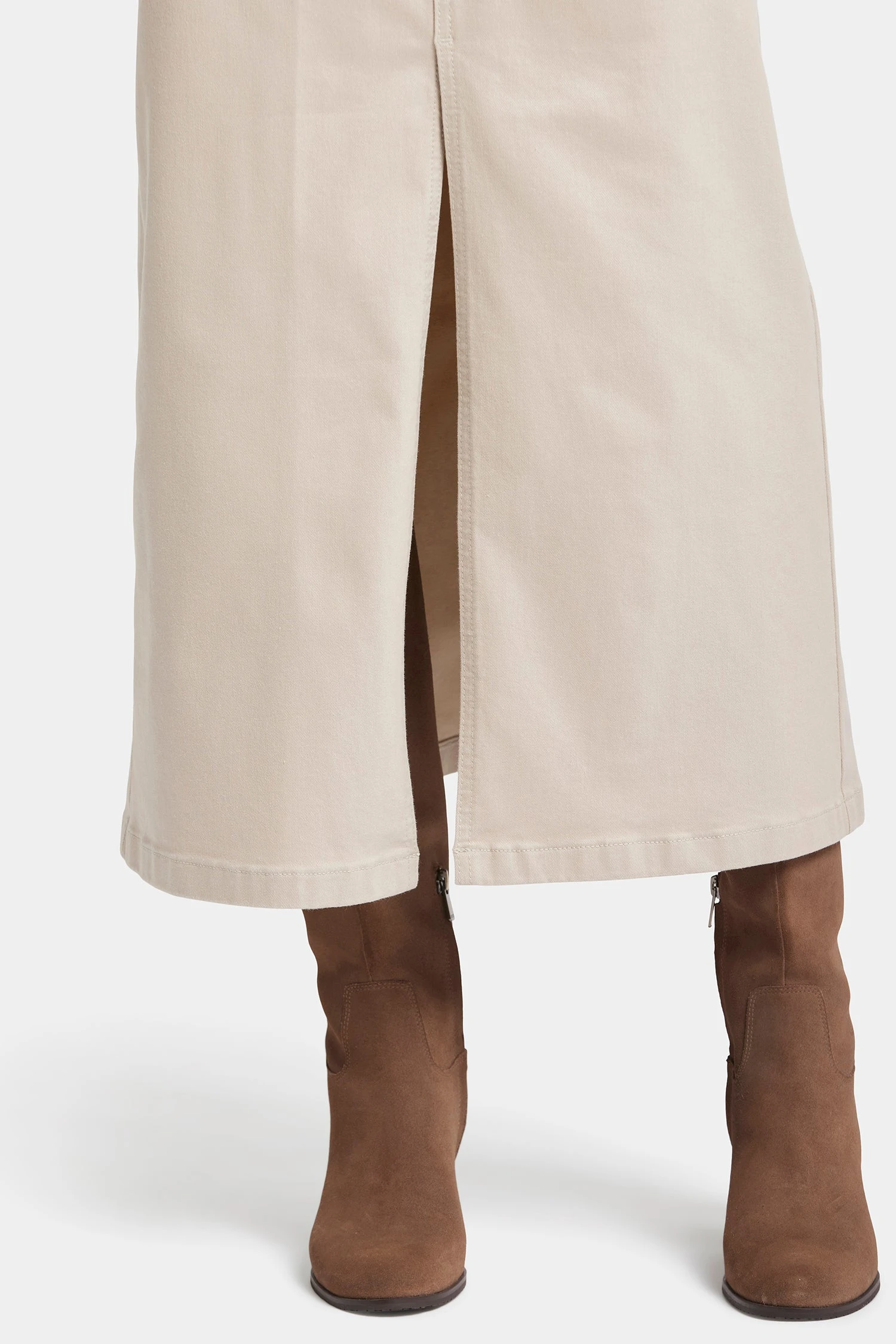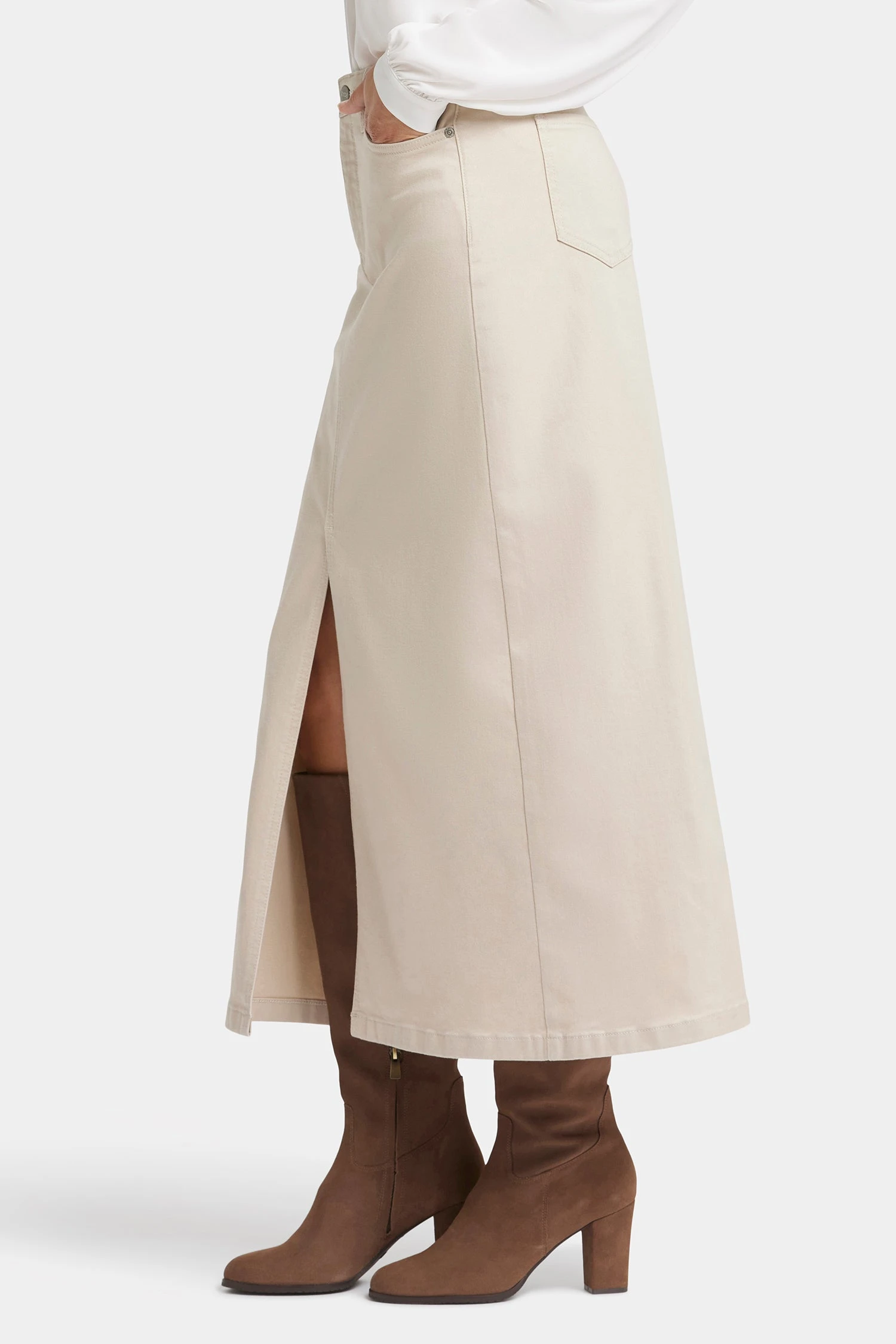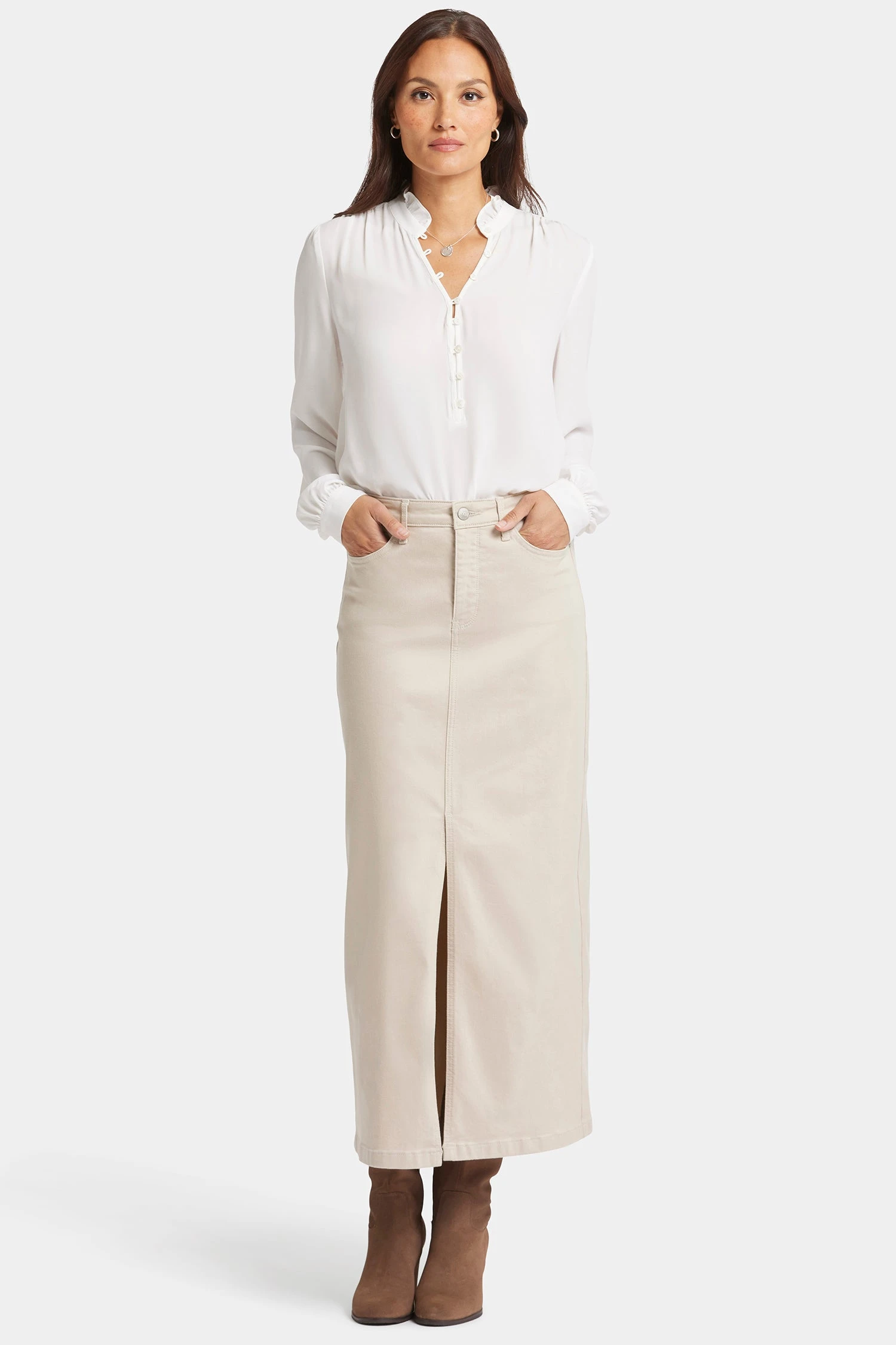 NYDJ’s High Rise Long Skirt is a classic wardrobe staple that you’ll get endless wears out of all season long. Our signature Lift Tuck® Technology provides just the right amount of support for a smooth, flawless figure—all thanks to an innovative, proprietary slimming panel with a patented criss-cross design. Finished with five-pocket styling, zip fly, button closure and center front slit for ease of movement. This skirt is made with earth-friendly methods that result in reduced consumption of water, chemicals and/or energy.