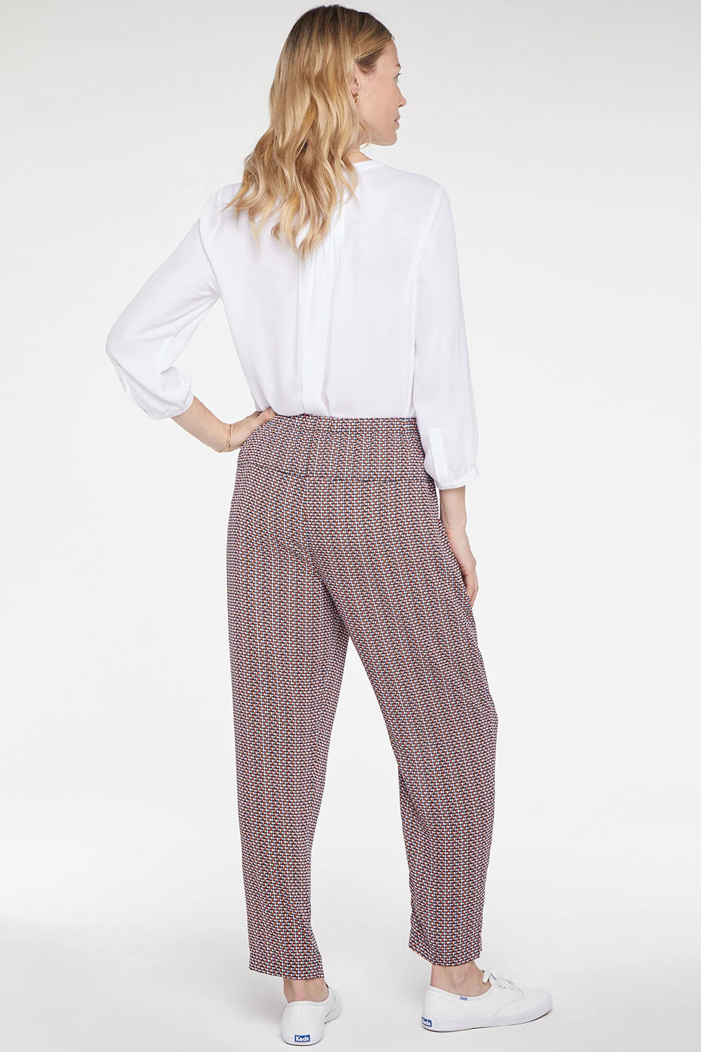 Take a break from jeans and mix things up with a pair of printed soft pants. The Ines Slim Pants by NYDJ are easy to dress up or down and so comfortable with their wide, pull-on stretch waistband. Front gathers and slightly tapered legs give them sophisticated shape, while front pockets add practical detail.Â