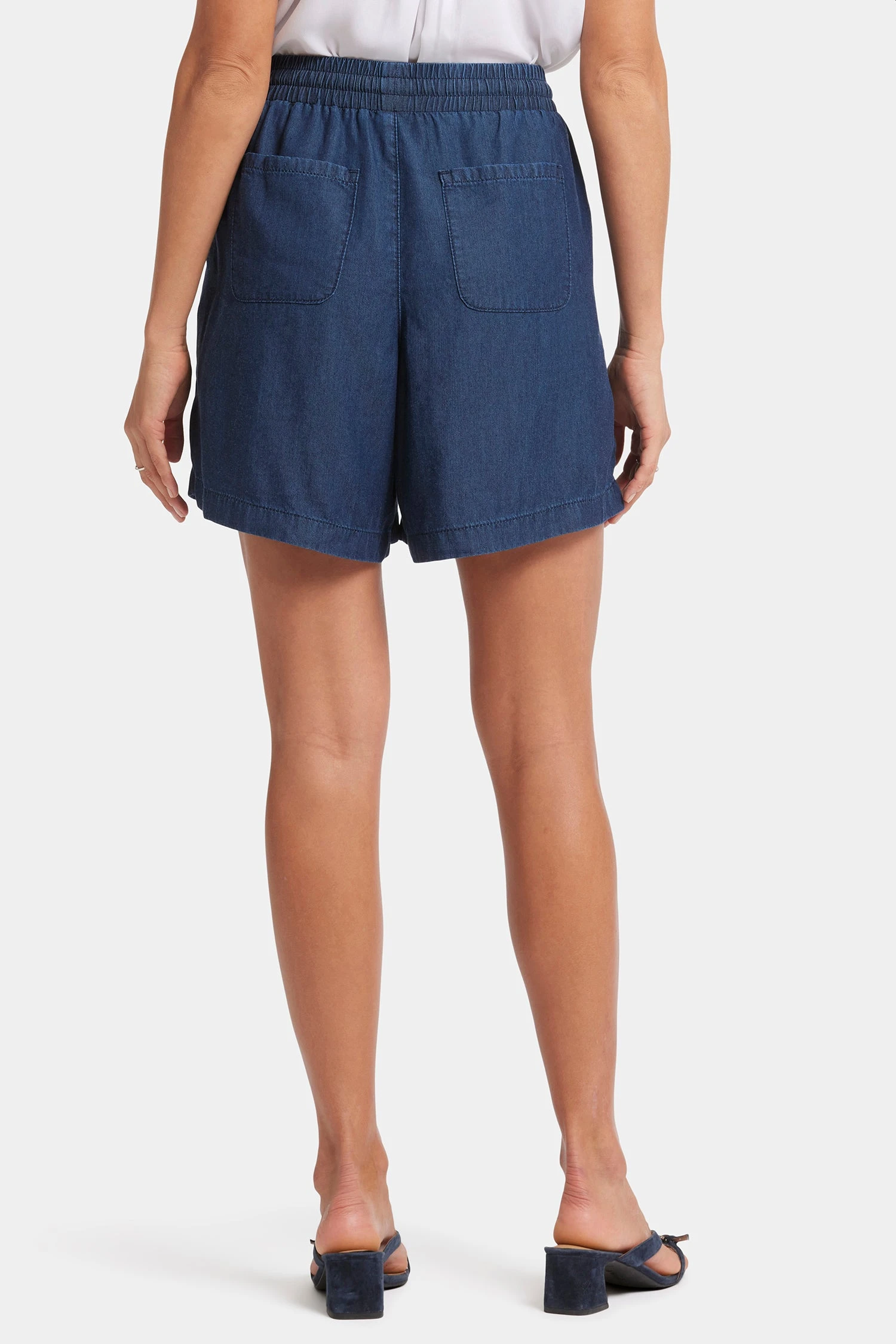 NYDJ’s Jayne Pull-On Shorts with Super High Rise make a bold statement and feel so breezy and comfortable. Designed to flatter, they have a stretchy high waist with a drawstring closure. Finished with convenient front slash pockets and back patch pockets. Indigo Ocean is a clean, super-dark indigo wash. This short is made with earth-friendly methods that result in reduced consumption of water, chemicals and/or energy.