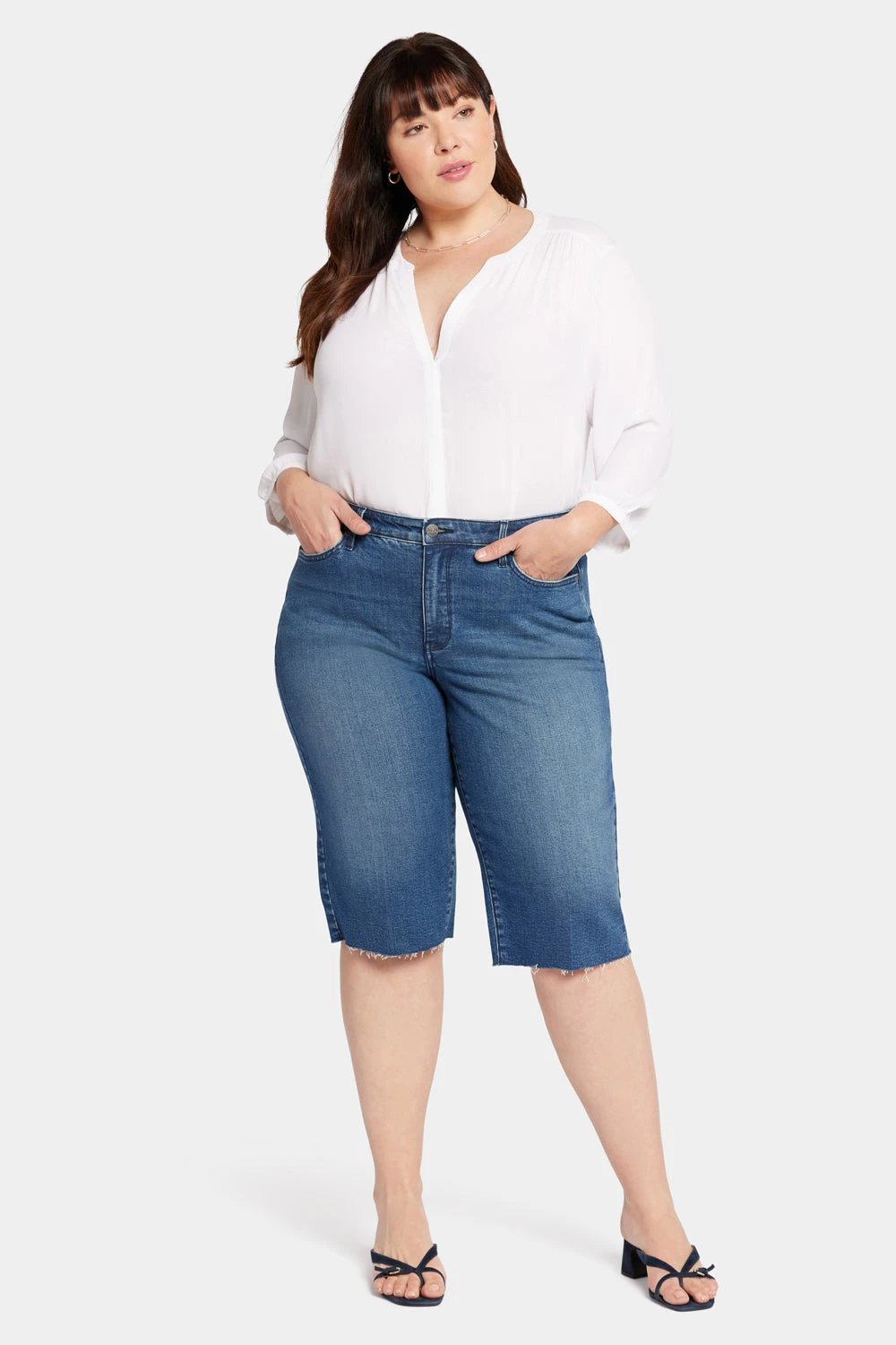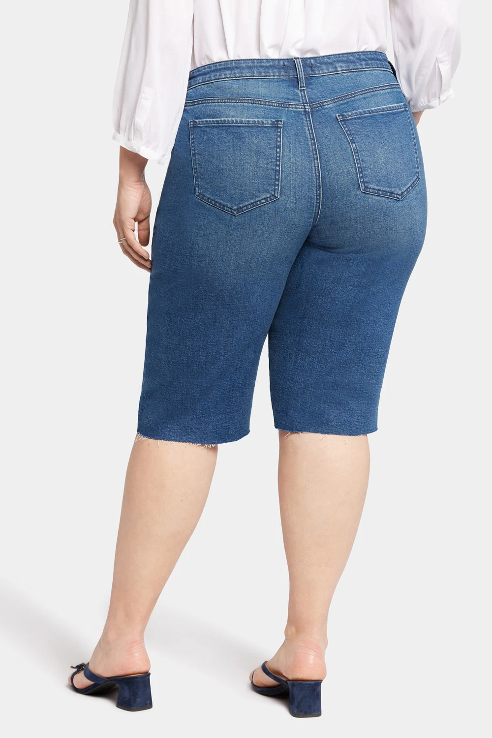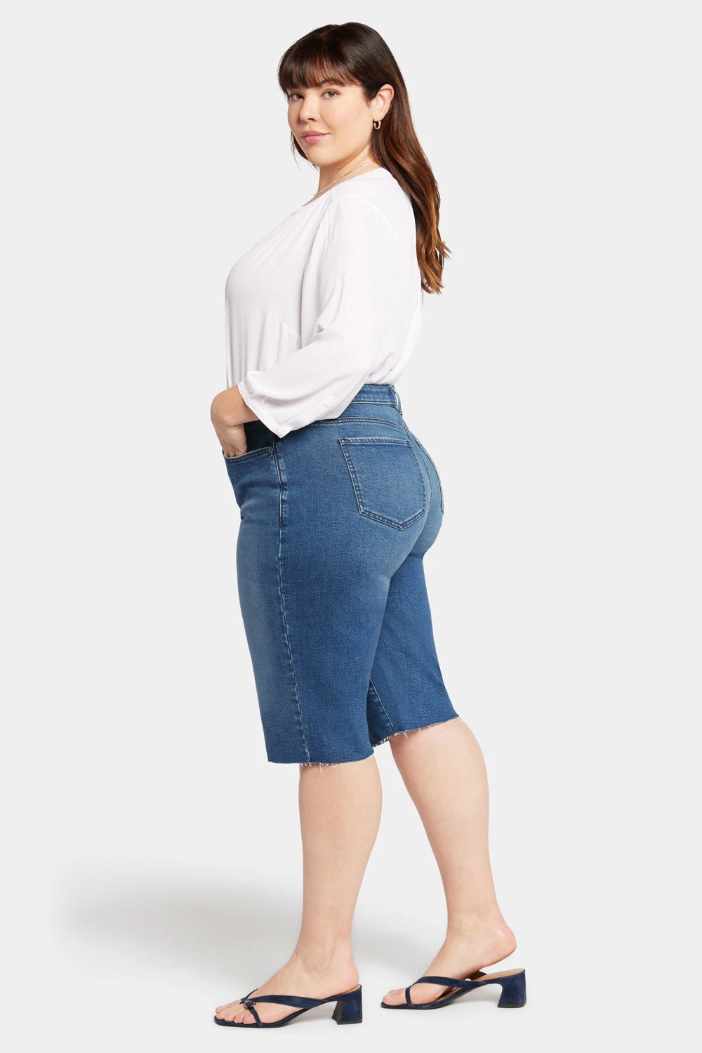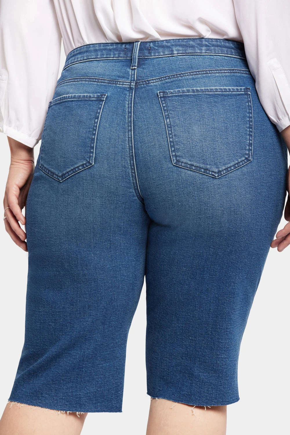 80s, but more flattering. NYDJ’s Kristie ’80s Bermuda Denim Shorts in Plus Size have a relaxed straight leg designed to hit just below the knee for a retro look. Lift Tuck® Technology flattens in front with a proprietary slimming panel. Features five pockets, zip fly, button waist, pressed creases and raw cut hems. Windfall is a medium dark wash with soft whiskers on the front hips and sanding throughout. This short is made with a sustainable polyester fiber created from 100% post-consumer plastic waste and with recycled cotton, resulting in less water and energy use and fewer greenhouse gas emissions without changing the look and feel of the fabric.