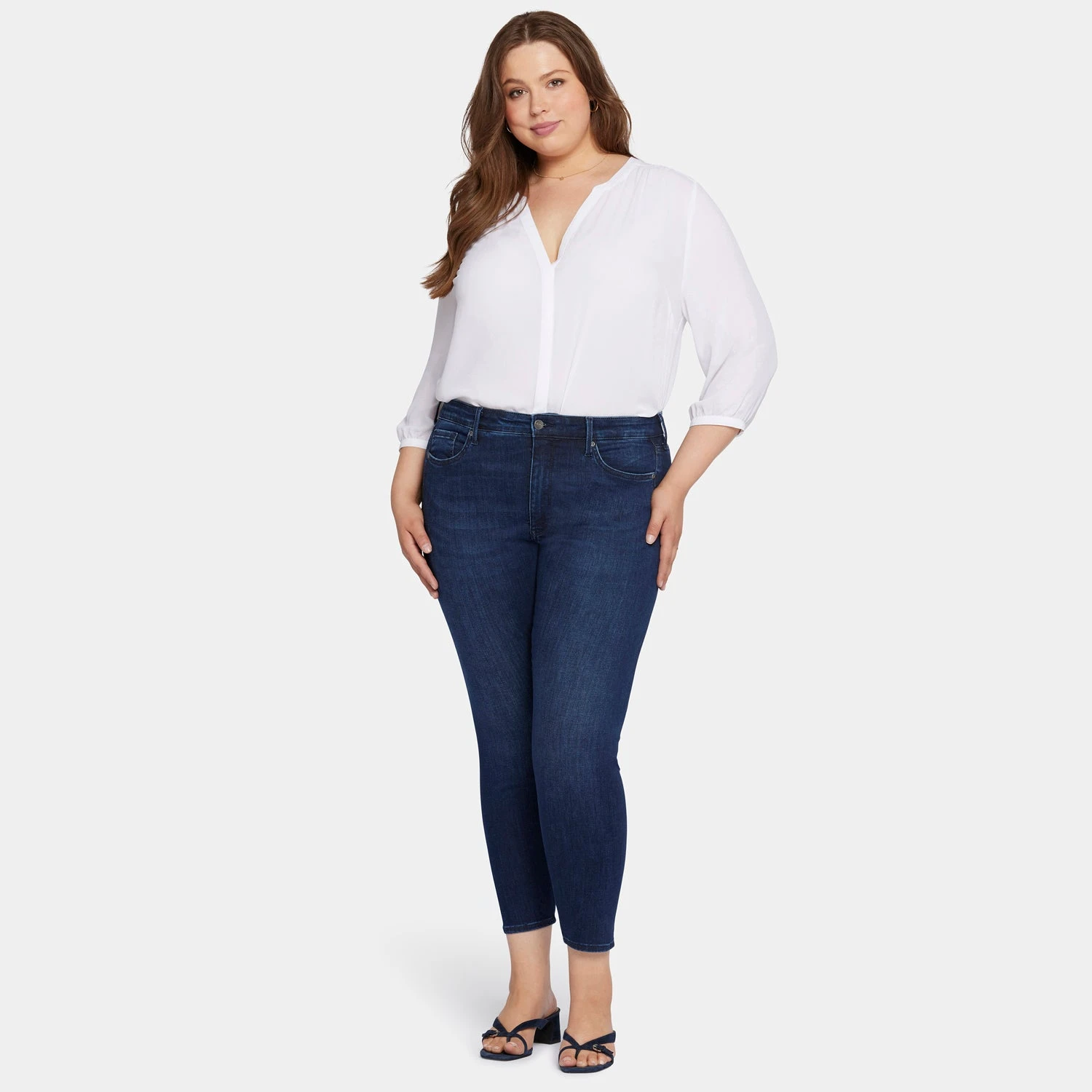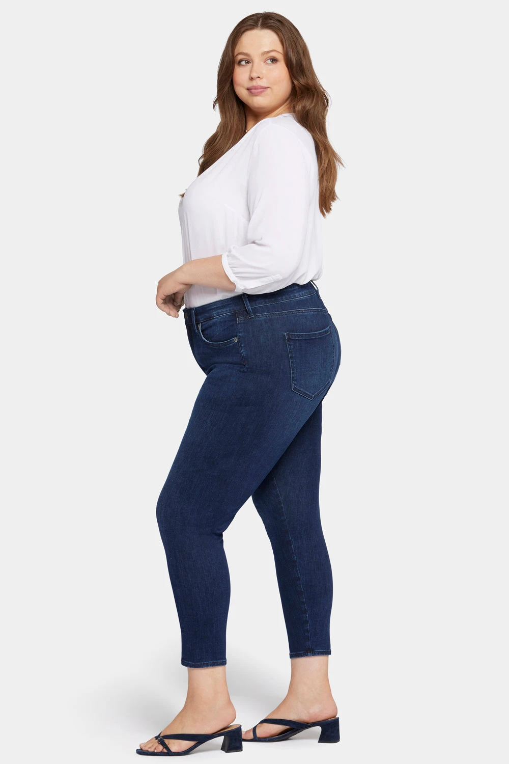 Le Silhouette Jeans are our most flattering jeans yet, offering a compression fit that smooths every curve without outseams to achieve a second-skin look and flawless silhouette. The NYDJ Le Silhouette Ami Skinny Jeans in Petite Plus Size with High Rise flatter every inch of you, giving you sculpted legs, a tucked tummy, lifted curves and an ultra-sleek look all over. Our unique Lift Tuck® Technology also helps flatten in the front by using a proprietary slimming panel with a patented criss-cross design. Features classic five-pocket styling, zip fly and button closure. Marvelous is a deep dark blue wash with whiskers on the front hips and medium-intensity sanding on the front thighs, knees and seat.