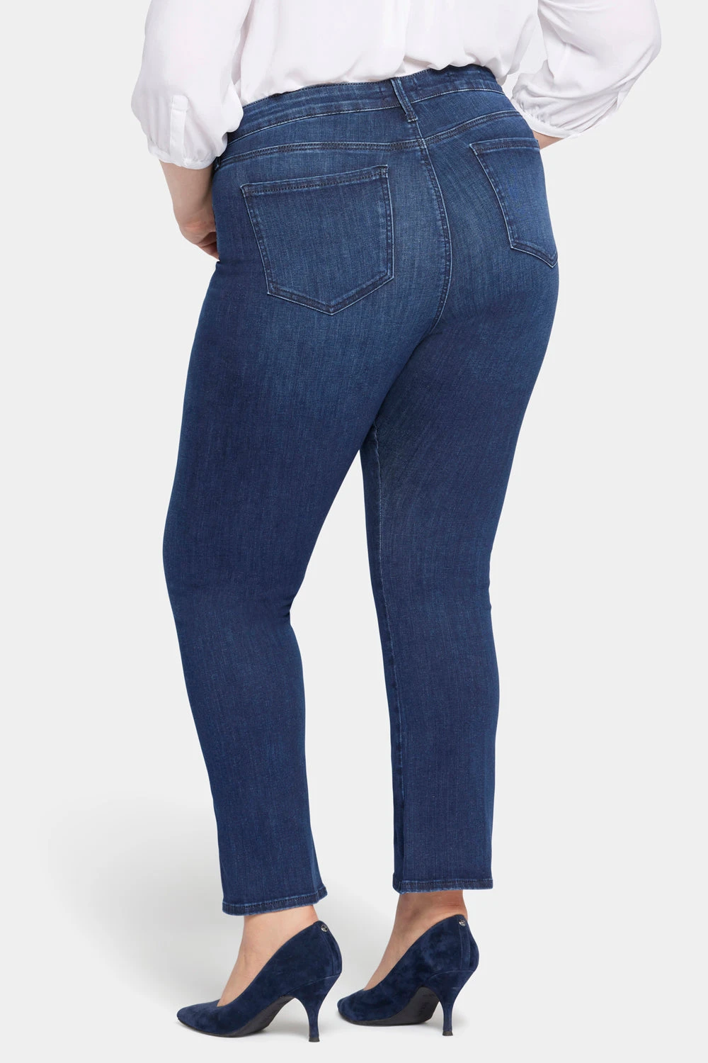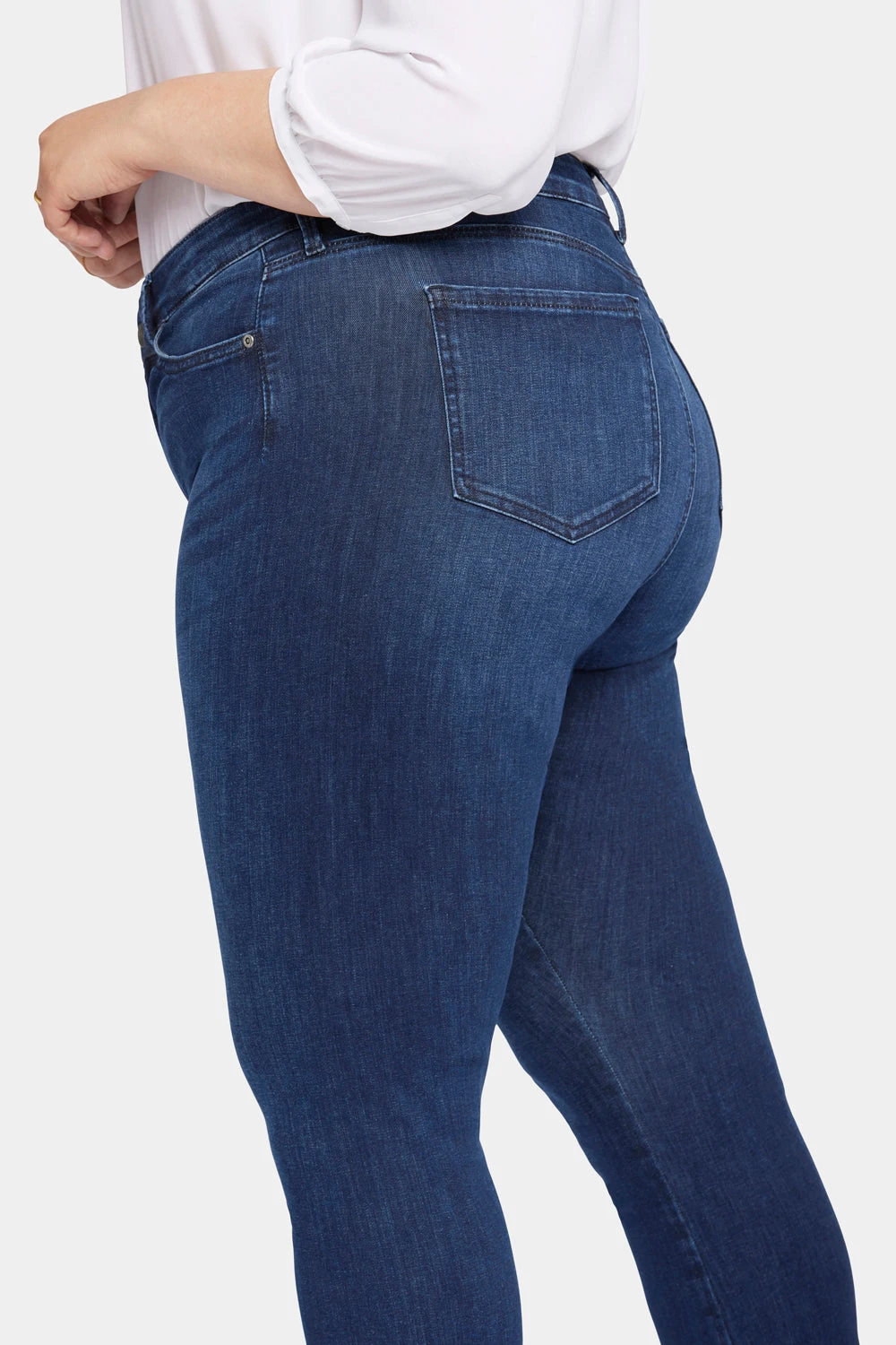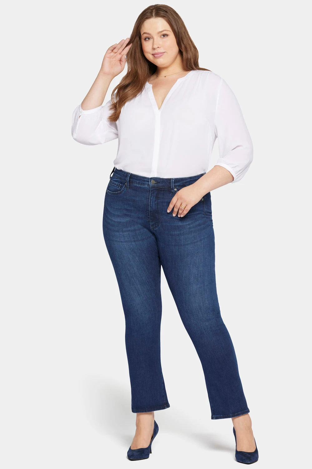 Le Silhouette Jeans are our most flattering jeans yet, offering a compression fit that smooths every curve without outseams to achieve a second-skin look and flawless silhouette. Sleek and slimming all over, the NYDJ Le Silhouette Slim Bootcut Jeans in Petite Plus Size with High Rise are narrow from the hip through the knee, with bootcut flare at the ankle. Our Lift Tuck® Technology uses a proprietary slimming panel with a patented criss-cross design to flatten in front and lift in back. Finished with a zip and button fly and classic five-pocket styling. Marvelous is a deep dark blue wash with whiskers on the front hips and medium-intensity sanding on the front thighs, knees and seat.