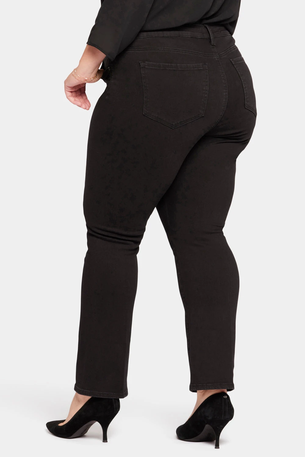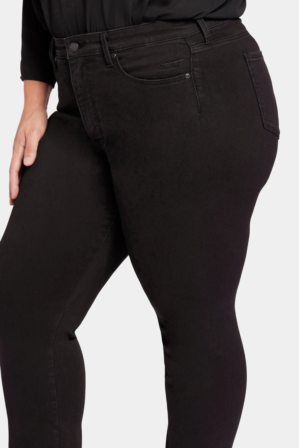 Le Silhouette Jeans are our most flattering jeans yet, offering a compression fit that smooths every curve without outseams to achieve a second-skin look and flawless silhouette. Sleek and slimming all over, the NYDJ Le Silhouette Slim Bootcut Jeans in Petite Plus Size with High Rise are narrow from the hip through the knee, with bootcut flare at the ankle. Our Lift Tuck® Technology uses a proprietary slimming panel with a patented criss-cross design to flatten in front and lift in back. Finished with a zip and button fly and classic five-pocket styling. Stellar is a vintage-inspired black wash with a lived-in look.