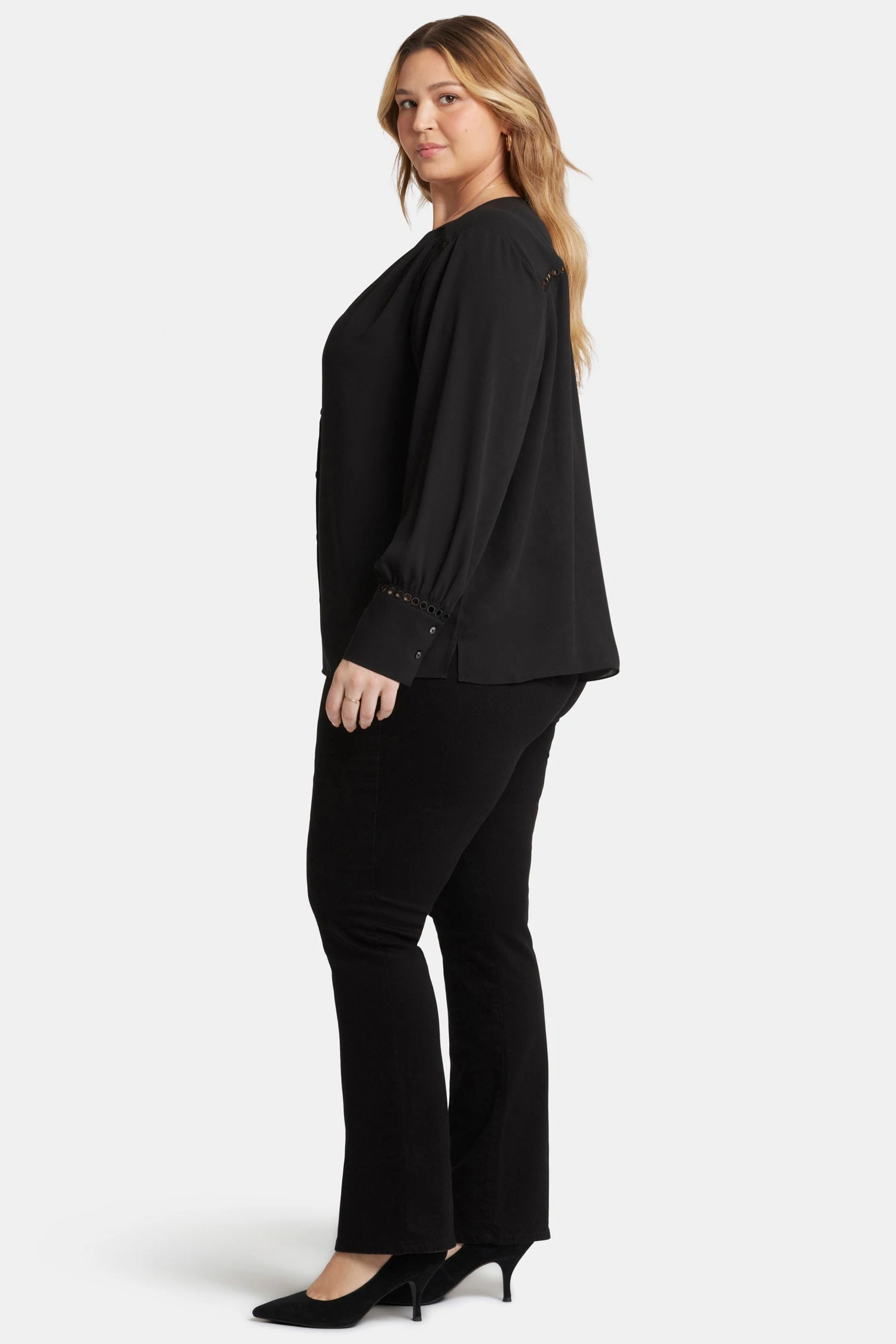 With its flowy silhouette and a soft, romantic details, NYDJ’s Liliana Peasant Blouse in Plus Size is perfect for dressing up your favorite denim. Front and back gathers and voluminous long sleeves with button cuffs give it a polished look, while peek-through soutache insets at the shoulders, back and cuffs add a pretty finish. Features a split neckline and front button closures. This blouse is made with a sustainable polyester fiber created from 100% post-consumer plastic waste, resulting in less water and energy use and fewer greenhouse gas emissions without changing the look and feel of the fabric. The buttons are made with 50% post-consumer recycled polyester.