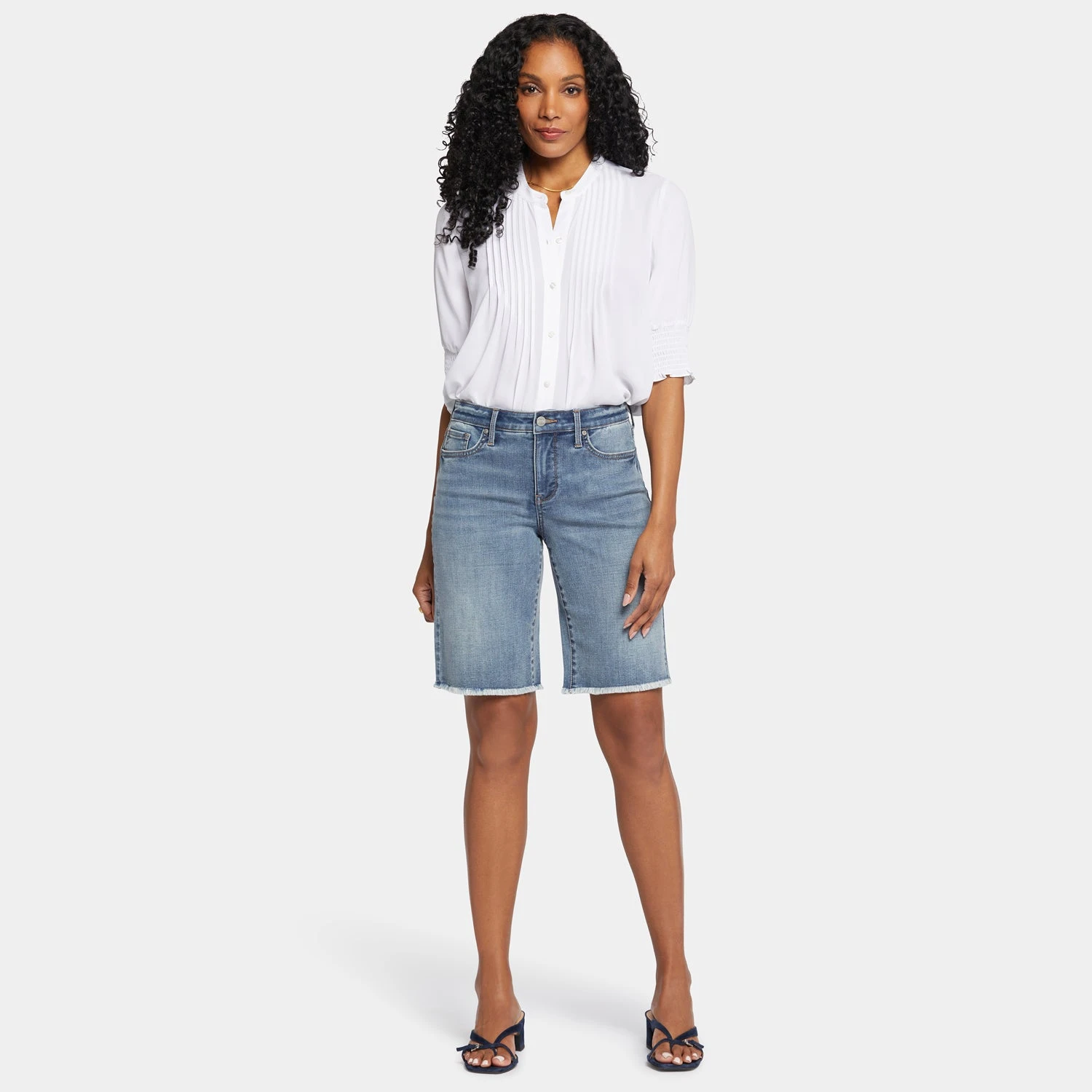NYDJ’s Lilly Denim Shorts are your new go-to, featuring a relaxed longer fit designed to hit just above the knee. Our Lift Tuck® Technology uses a slimming panel with a criss-cross design to shape curves. Features a zip fly, button waist and frayed hems. Paddington is a grey-toned medium blue wash with tucks near the front pockets and along the waistband as well as blended whiskers and soft hand sanding on the thighs and back pockets. This short is made with earth-friendly methods that result in reduced consumption of water, chemicals and/or energy.