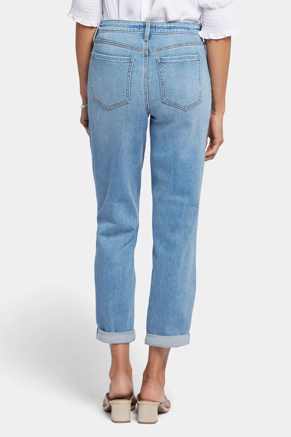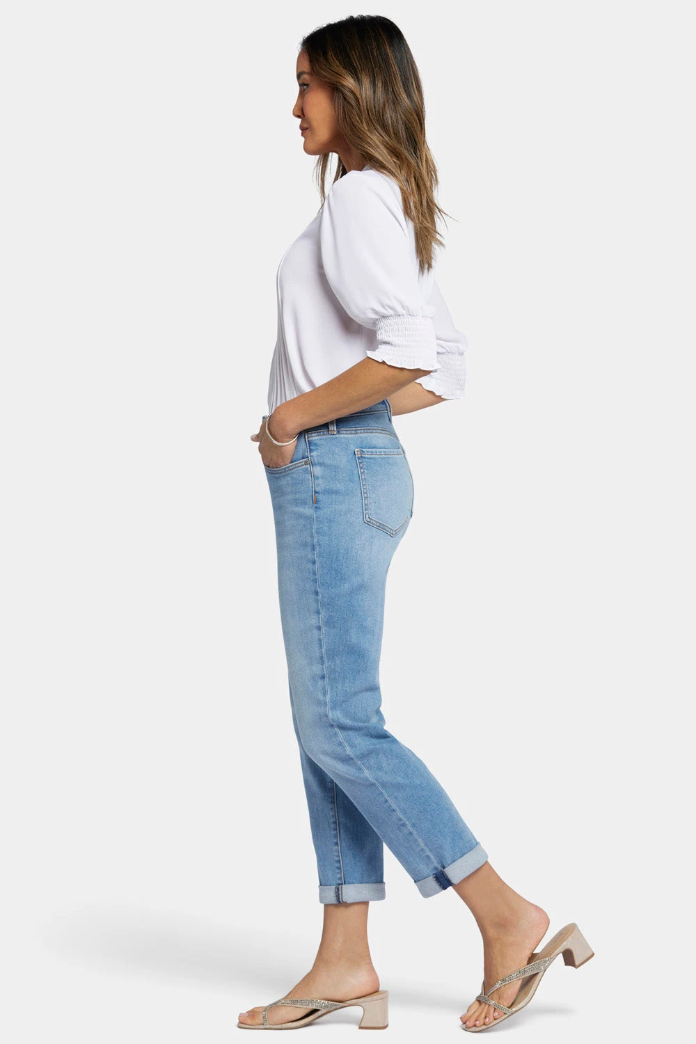 That perfect relaxed denim fit you’ve been looking for? It’s here, in the Margot Girlfriend Jeans by NYDJ. Their just-slouchy-enough cut is slimmer (and more slimming) than a boyfriend jean while maintaining a laid-back looseness through the leg. Our signature Lift Tuck® Technology makes the fit extra flattering by using a patented criss-cross design inside to shape and support your curves. Features a zip fly with button closure, classic five-pocket styling and adjustable rolled cuffs. Corfu is a medium-light blue wash with a vintage tint, soft whiskers on the front hips and fading on the front thighs and seat. This jean is made with earth-friendly methods that result in reduced consumption of water, chemicals and/or energy.