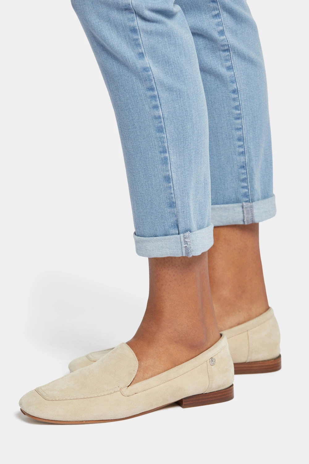 That perfect relaxed denim fit you’ve been looking for? It’s here, in the Margot Girlfriend Jeans in Petite by NYDJ. Their just-slouchy-enough cut is slimmer (and more slimming) than a boyfriend jean while maintaining a laid-back looseness through the leg. Our signature Lift Tuck® Technology makes the fit extra flattering by using a patented criss-cross design inside to shape and support your curves. Breathable, temperature-regulating Cool Embrace® Denim keeps you comfortable as the heat rises. Features a zip fly with button closure, classic five-pocket styling and adjustable rolled cuffs. Kingston is a medium-light indigo stone wash with subtle whiskers, inner-thigh chevrons and hand sanding on the front thighs and seat. This jean is made with earth-friendly methods that result in reduced consumption of water, chemicals and/or energy.