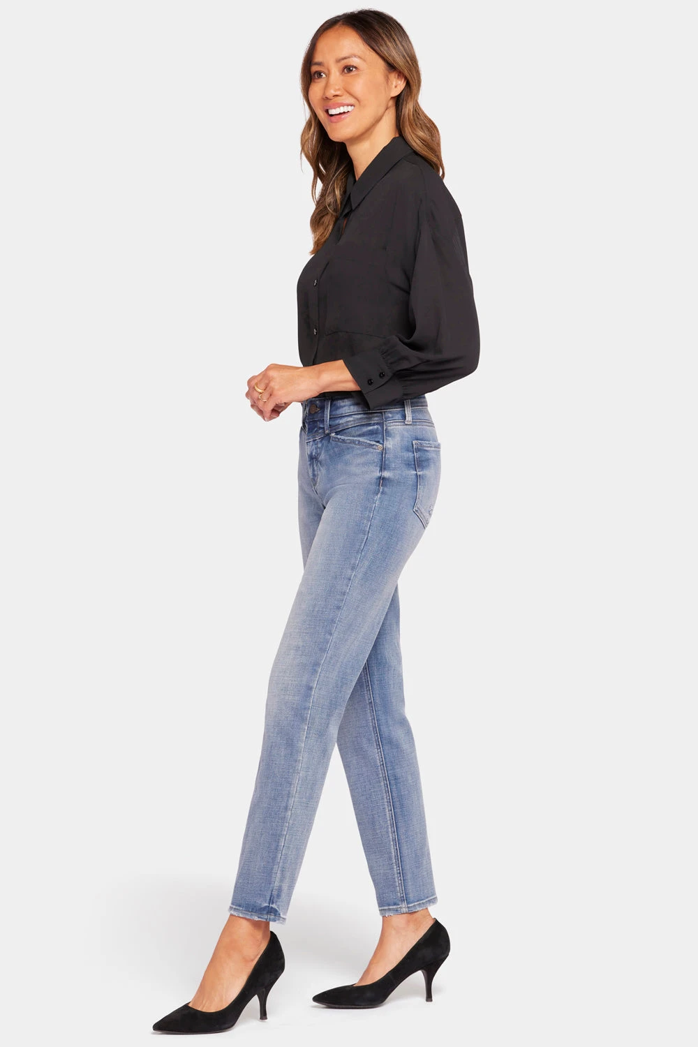 That perfect relaxed denim fit you’ve been looking for? It’s here, in the Margot Girlfriend Jeans with Front Yoke and Angled Pockets by NYDJ. This jean has a vintage-inspired front yoke, and its just-slouchy-enough cut is slimmer (and more slimming) than a boyfriend jean while maintaining a laid-back looseness through the leg. Our signature Lift Tuck® Technology makes the fit extra flattering by using a patented criss-cross design inside to shape and support your curves. Features a zip fly with button closure, two angled front pockets and two back patch pockets. Romance is a medium wash that features tucks and highs and lows along seams, soft whiskers on the front hips, thigh sanding and distressing on the pockets and hems. This jean is made with earth-friendly methods that result in reduced consumption of water, chemicals and/or energy.