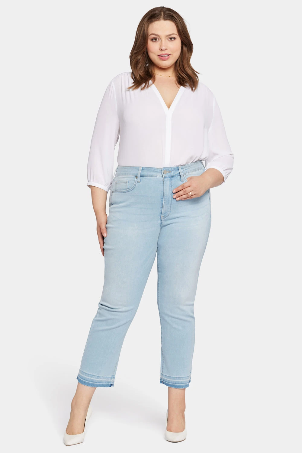 This classic fit can do no wrong. NYDJ’s easy, figure-elongating Marilyn Straight Ankle Jeans in Petite Plus Size with High Rise and Released Hems have a versatile straight-leg silhouette that hits perfectly at the ankle and a higher rise than our original Marilyn Straight Ankle Jeans. Cool Embrace® Denim makes rising temperatures a breeze by using best-of-its-kind, moisture-wicking technology to keep you cool and comfortable. Our Lift Tuck® Technology uses a proprietary slimming panel with a patented criss-cross design to further shape and support your curves. Finished with classic five-pocket styling, a zip fly with button closure and released hems. Brightside is a light wash with plenty of vintage character. Stunning is a medium wash with softly faded whiskers on the front hips, inner-thigh chevrons, abrasions along the seams and hand sanding throughout.