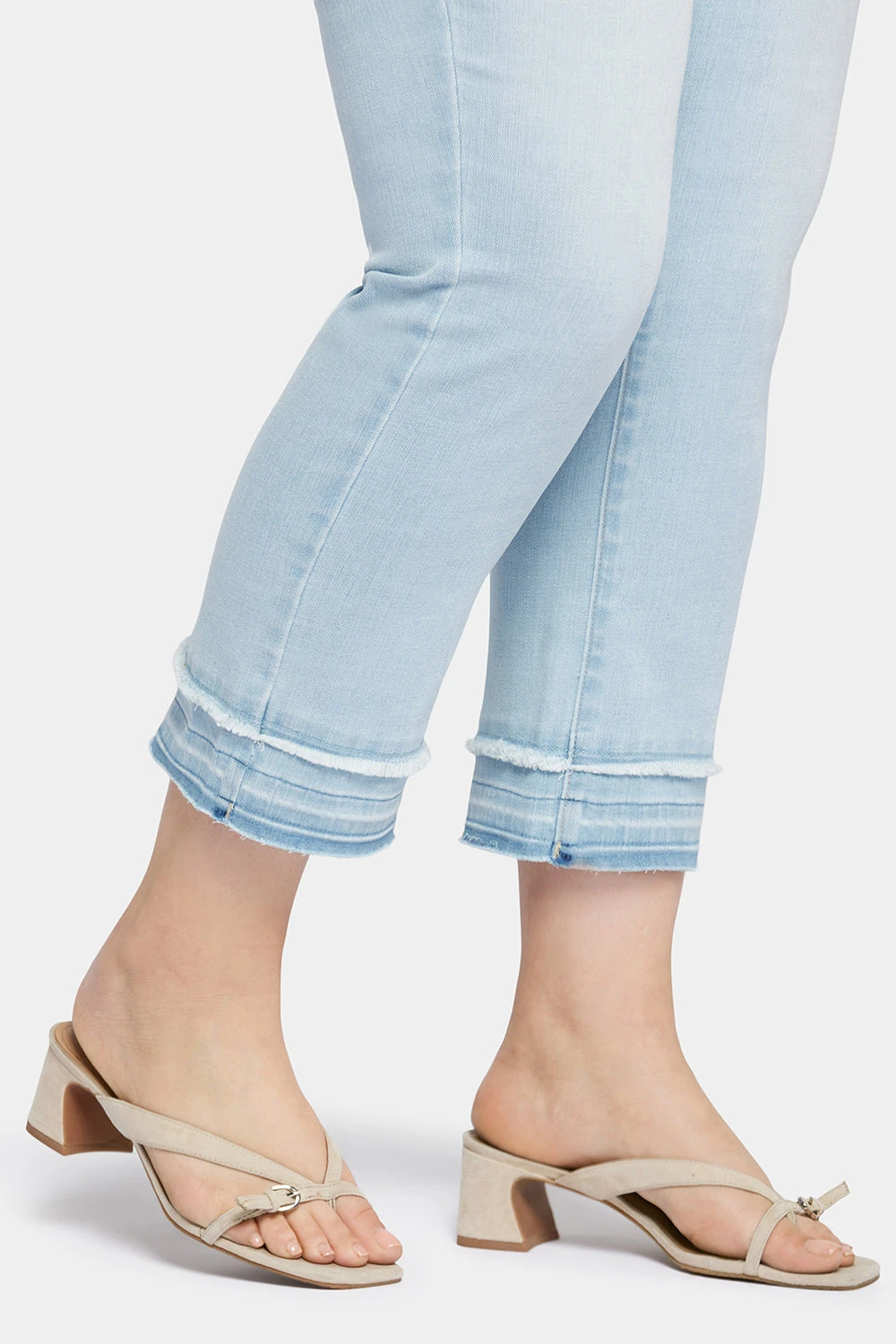 This classic fit can do no wrong. NYDJ’s easy, figure-elongating Marilyn Straight Ankle Jeans in Plus Size with Attached Released Hems have a versatile straight-leg silhouette that hits perfectly at the ankle. Our Lift Tuck® Technology uses a proprietary slimming panel with a patented criss-cross design to shape and support your curves. Finished with five-pocket styling, a zip fly with button closure and attached released hems for a unique boho look. Inspire is a rich, dark wash featuring feathered whiskers on the front hips and hand sanding on the waistband, front thighs and seat. Brightside is a light wash with plenty of vintage character. This jean is made with earth-friendly methods that result in reduced consumption of water, chemicals and/or energy.