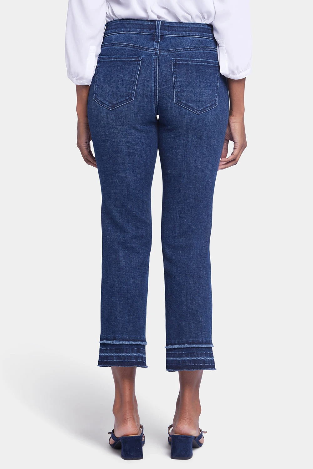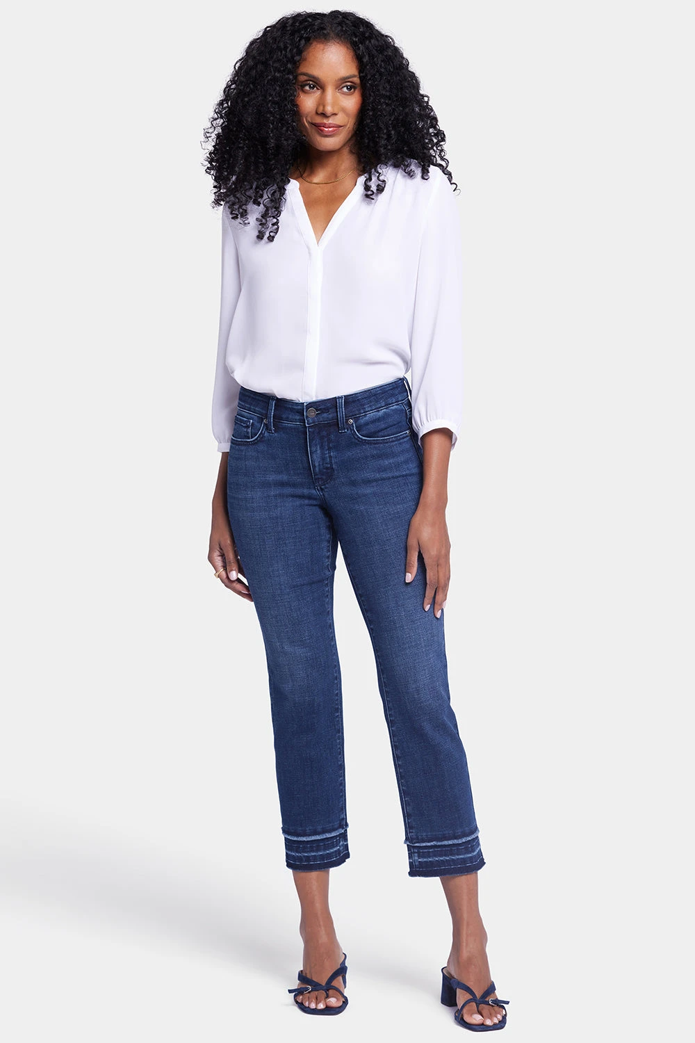 This classic fit can do no wrong. NYDJ’s easy, figure-elongating Marilyn Straight Ankle Jeans with Attached Released Hems have a versatile straight-leg silhouette that hits perfectly at the ankle. Our Lift Tuck® Technology uses a proprietary slimming panel with a patented criss-cross design to shape and support your curves. Finished with five-pocket styling, a zip fly with button closure and attached released hems for a unique boho look. Inspire is a rich, dark wash featuring feathered whiskers on the front hips and hand sanding on the waistband, front thighs and seat. This jean is made with earth-friendly methods that result in reduced consumption of water, chemicals and/or energy.