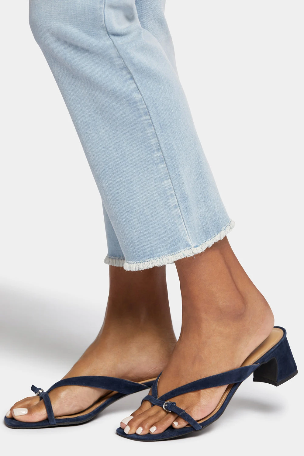 NYDJ’s Marilyn Straight Ankle Jeans with Double-Button Fly and Frayed Hems feature a flattering straight-leg fit that pairs well with everything. Our unique Lift Tuck® Technology helps flatten in the front by using a proprietary slimming panel with a patented criss-cross design. Features five-pocket styling, double-button zip fly and frayed hems. Westminster is a light wash with a vintage tint and tacking details near the front pockets, a subtle cloudy effect created by allover sanding and distressed pocket edges and hems. This jean is made with earth-friendly methods that result in reduced consumption of water, chemicals and/or energy.