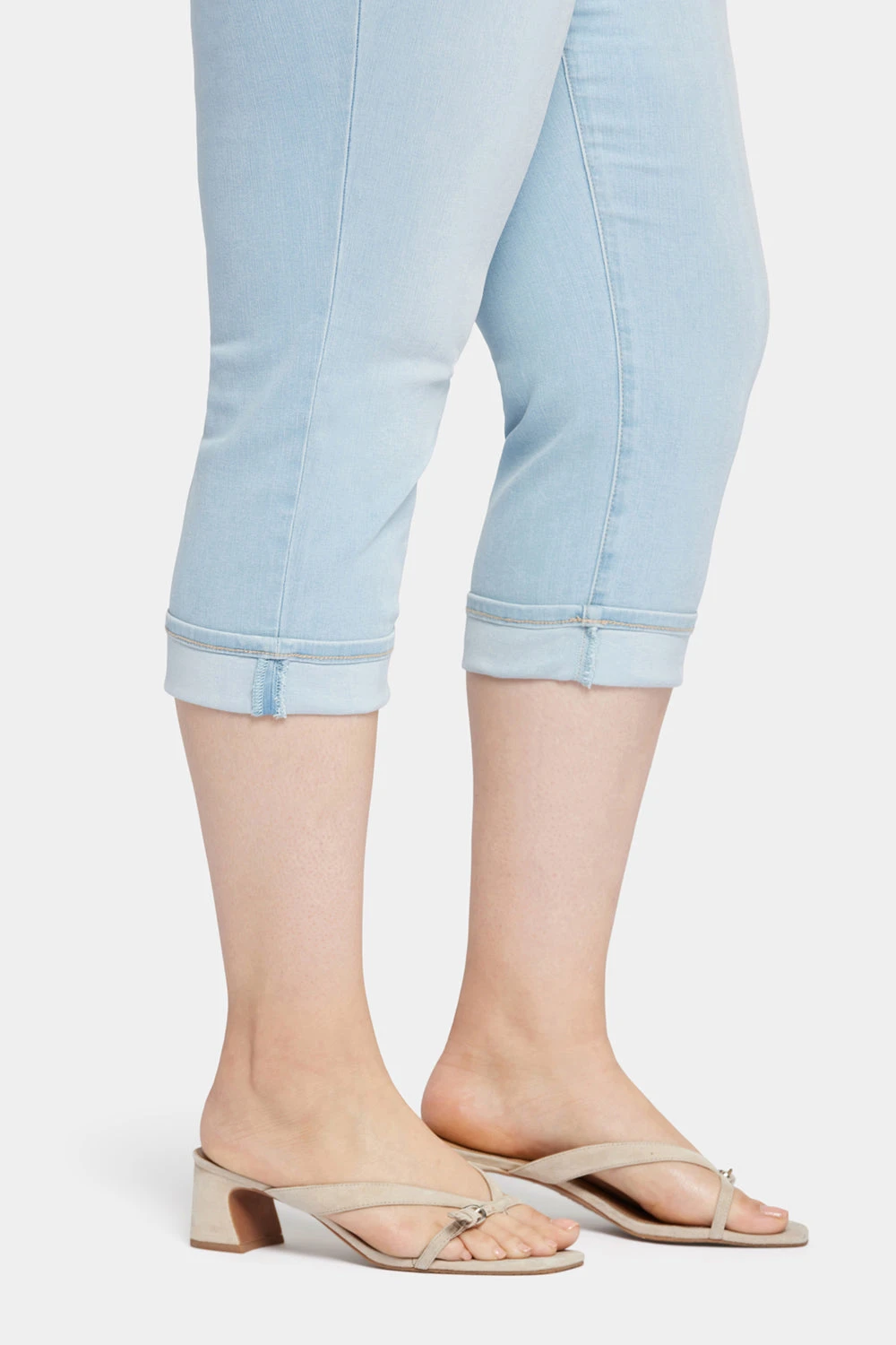 Short and sweet—that’s how we like our warm-weather denim. Meet NYDJ’s Marilyn Straight Crop Jeans in Plus Size in Cool Embrace® Denim, featuring classic five-pocket styling, a zip fly with button closure and a cuffed hem for an extra touch of attitude. Cool Embrace® denim makes rising temperatures a breeze by using best-of-its-kind, moisture-wicking technology to keep you cool and comfortable. Like all NYDJ jeans, this style has our Lift Tuck® Technology, which uses a proprietary slimming panel with a patented criss-cross design to trim your waist. These easy-to-wear, easy-to-love, cropped-length women’s jeans pair perfectly with flats and heels alike. Our Hollander wash features light distressing on the front and back pocket edges.