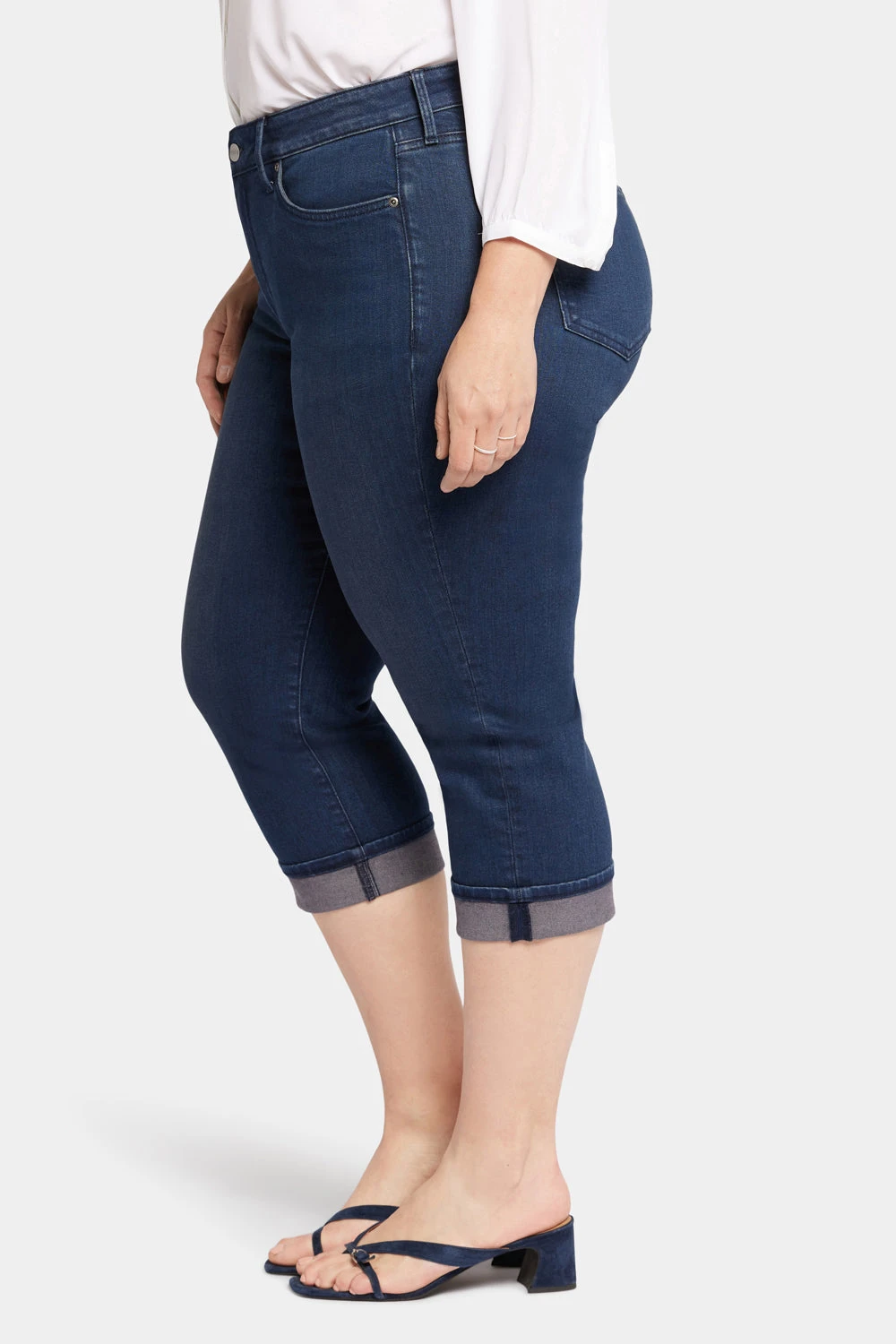 Short and sweet—that’s how we like our warm-weather denim. Meet NYDJ’s Marilyn Straight Crop Jeans in Plus Size, featuring classic five-pocket styling, a zip fly with button closure and a cuffed hem for an extra touch of attitude. Like all NYDJ jeans, this style has our Lift Tuck® Technology, which uses a proprietary slimming panel with a patented criss-cross design to trim your waist. These easy-to-wear, easy-to-love, cropped-length women’s jeans pair perfectly with flats and heels alike. Afterglow is a vintage-inspired light stone wash with tacking along the waistband and fly, whiskers on the front hips, soft hand sanding and inner-thigh chevrons. Upbeat is a medium light indigo wash with whiskers on the front hips and sanding on the front thighs and seat. Windfall is a medium dark wash with soft whiskers on the front hips and sanding throughout. This jean is made with a sustainable polyester fiber created from 100% post-consumer plastic waste and with recycled cotton, resulting in less water and energy use and fewer greenhouse gas emissions without changing the look and feel of the fabric.