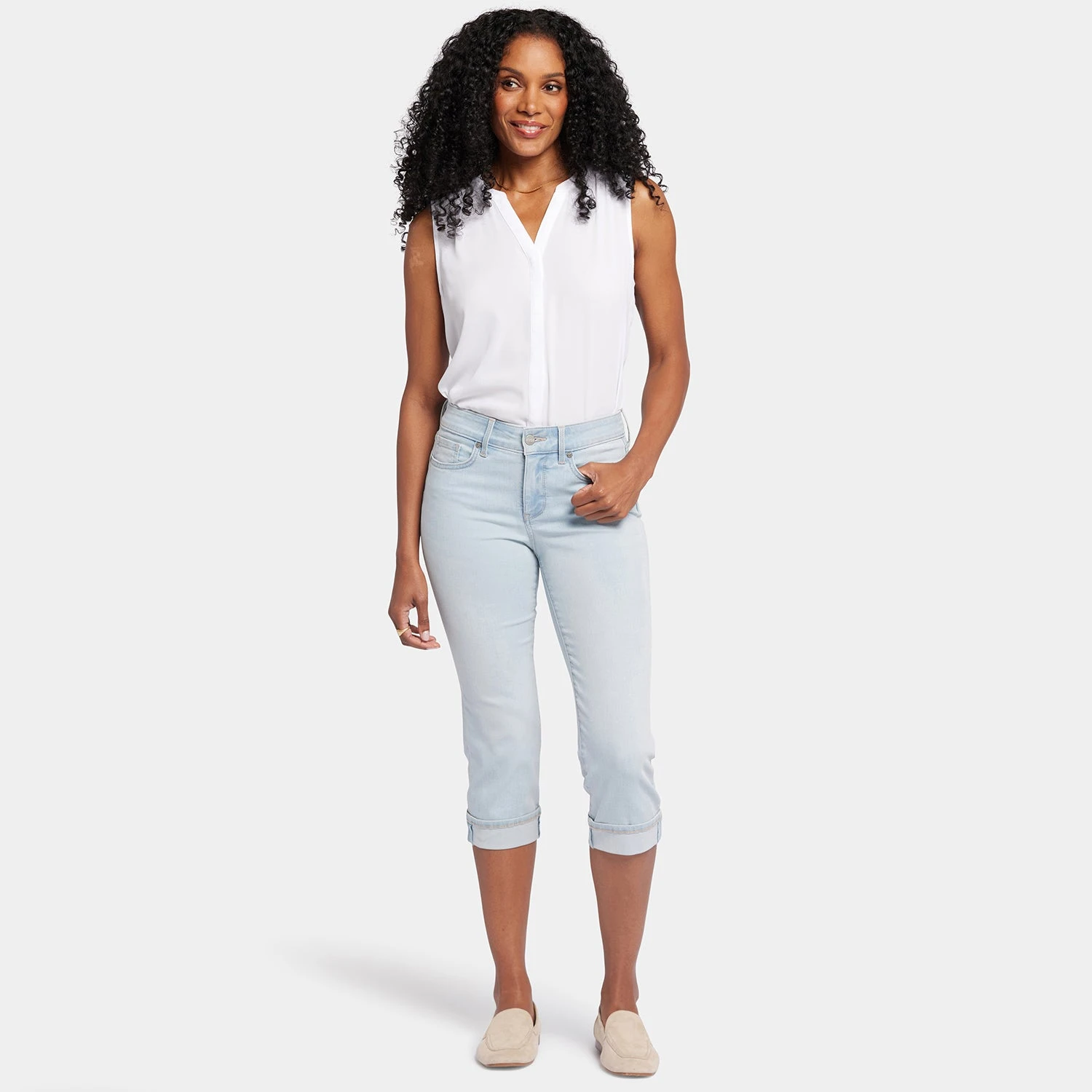 Short and sweet—that’s how we like our warm-weather denim. Meet NYDJ’s Marilyn Straight Crop Jeans in Cool Embrace® Denim, featuring classic five-pocket styling, a zip fly with button closure and a cuffed hem for an extra touch of attitude.This breathable, temperature-regulating denim features COOLMAX® technology to keep you comfortable as the heat rises. Like all NYDJ jeans, this style has our Lift Tuck® Technology, which uses a proprietary slimming panel with a patented criss-cross design to trim your waist. These easy-to-wear, easy-to-love, cropped-length women’s jeans pair perfectly with flats and heels alike. This jean is made with earth-friendly methods that result in reduced consumption of water, chemicals and/or energy.