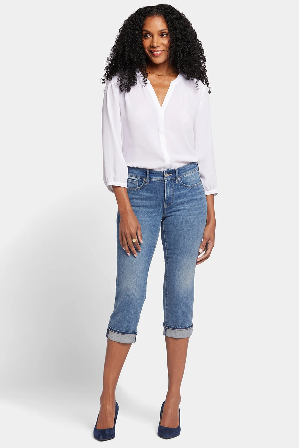 Short and sweet—that’s how we like our warm-weather denim. Meet NYDJ’s Marilyn Straight Crop Jeans with Cuffs featuring classic five-pocket styling, a zip fly with button closure and a cuffed hem for an extra touch of attitude. Like all NYDJ jeans, this style has our Lift Tuck® Technology, which uses a proprietary slimming panel with a patented criss-cross design to trim your waist. These easy-to-wear, easy-to-love, cropped-length women’s jeans pair perfectly with flats and heels alike. Afterglow is a vintage-inspired light stone wash with tacking along the waistband and fly, whiskers on the front hips, soft hand sanding and inner-thigh chevrons. Upbeat is a medium light indigo wash with whiskers on the front hips and sanding on the front thighs and seat. Windfall is a medium dark wash with soft whiskers on the front hips and sanding throughout. This jean is made with a sustainable polyester fiber created from 100% post-consumer plastic waste and with recycled cotton, resulting in less water and energy use and fewer greenhouse gas emissions without changing the look and feel of the fabric.