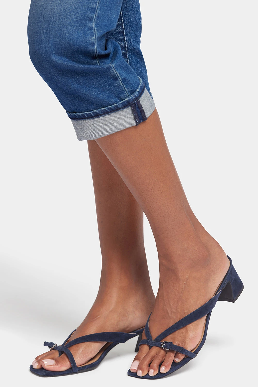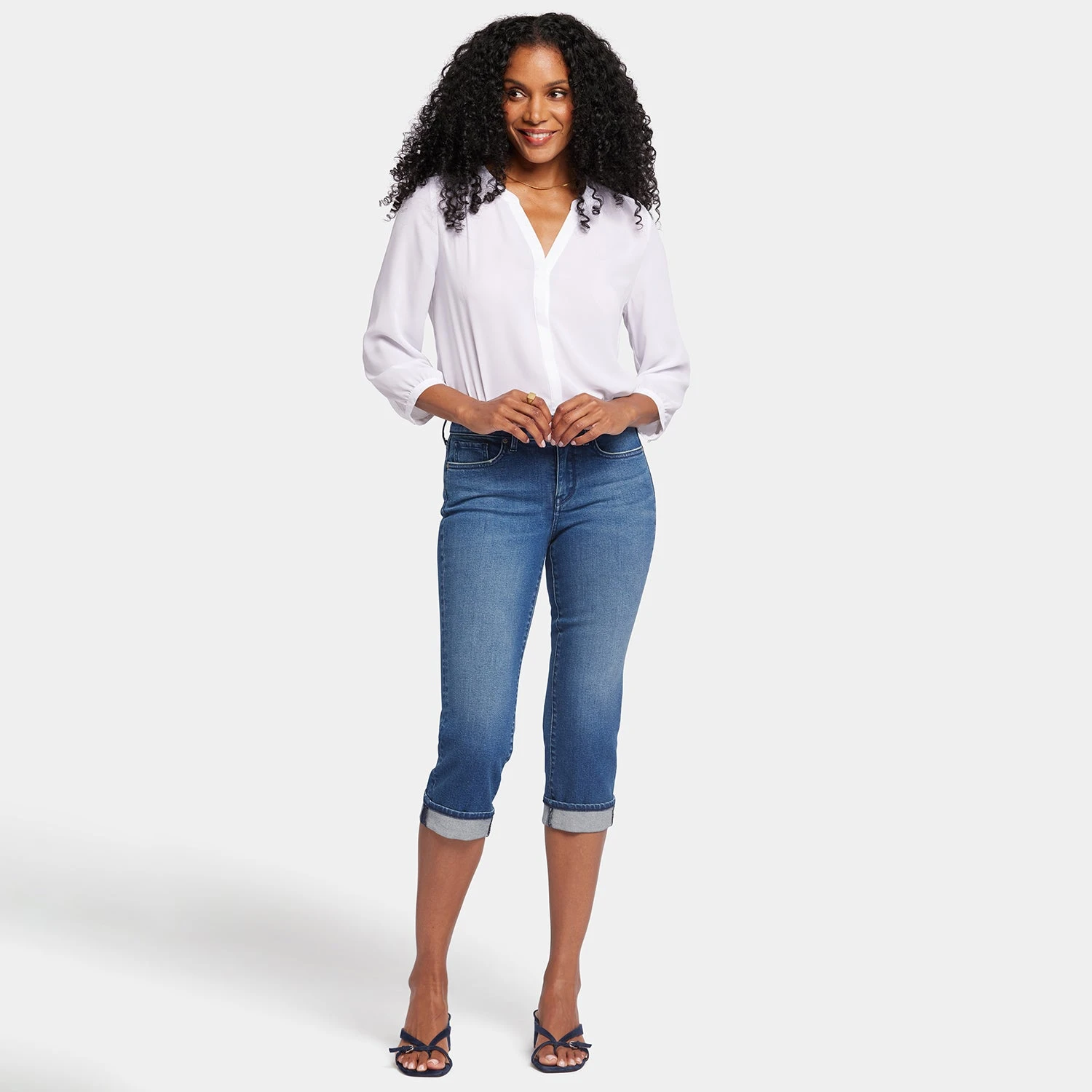 Short and sweet—that’s how we like our warm-weather denim. Meet NYDJ’s Marilyn Straight Crop Jeans with Cuffs featuring classic five-pocket styling, a zip fly with button closure and a cuffed hem for an extra touch of attitude. Like all NYDJ jeans, this style has our Lift Tuck® Technology, which uses a proprietary slimming panel with a patented criss-cross design to trim your waist. These easy-to-wear, easy-to-love, cropped-length women’s jeans pair perfectly with flats and heels alike. Afterglow is a vintage-inspired light stone wash with tacking along the waistband and fly, whiskers on the front hips, soft hand sanding and inner-thigh chevrons. Upbeat is a medium light indigo wash with whiskers on the front hips and sanding on the front thighs and seat. Windfall is a medium dark wash with soft whiskers on the front hips and sanding throughout. This jean is made with a sustainable polyester fiber created from 100% post-consumer plastic waste and with recycled cotton, resulting in less water and energy use and fewer greenhouse gas emissions without changing the look and feel of the fabric.