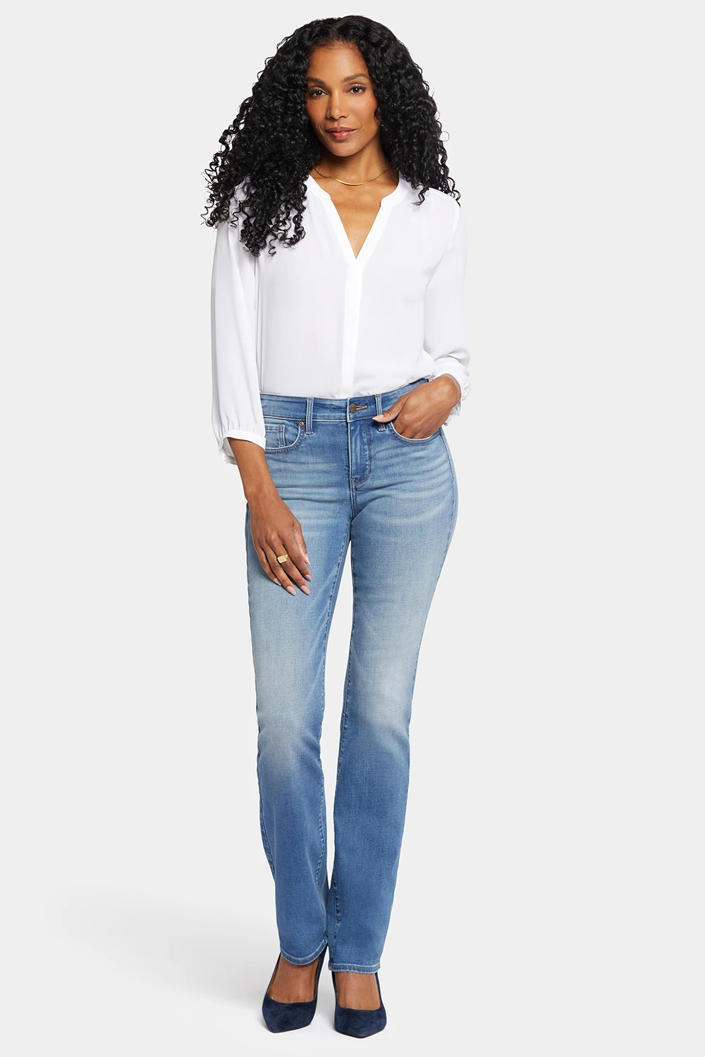 The easy, figure-elongating construction of the NYDJ Marilyn Straight Jeans in Petite pairs well with everything, thanks to a flattering waist and a versatile straight-leg fit. Lift Tuck® Technology uses a proprietary slimming panel with a patented criss-cross design to shape and support your curves for an always-sleek silhouette. Finished with classic five-pocket styling, zip fly and button closure.