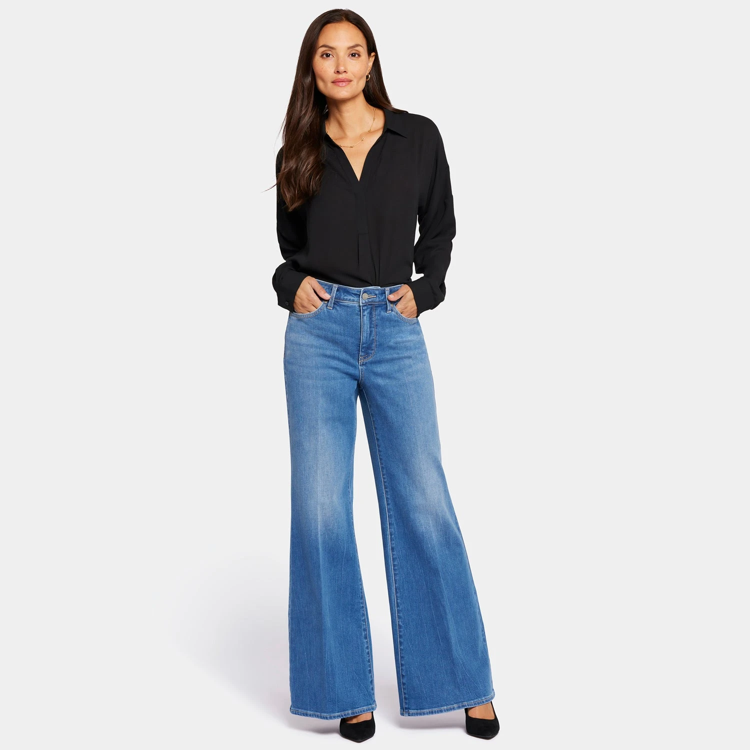 NYDJ’s Mia Palazzo Jeans make a bold, breezy statement with their super-flared legs. Sitting high on the waist, this pair has a flattering fit that hugs the hips and thighs and is detailed with center-leg creases. Our Lift Tuck® Technology uses a proprietary slimming panel with a patented criss-cross design to shape and support your curves for an always-sleek silhouette. Features five-pocket styling and a zip fly with button closure. This jean is made with earth-friendly methods that result in reduced consumption of water, chemicals and/or energy.
