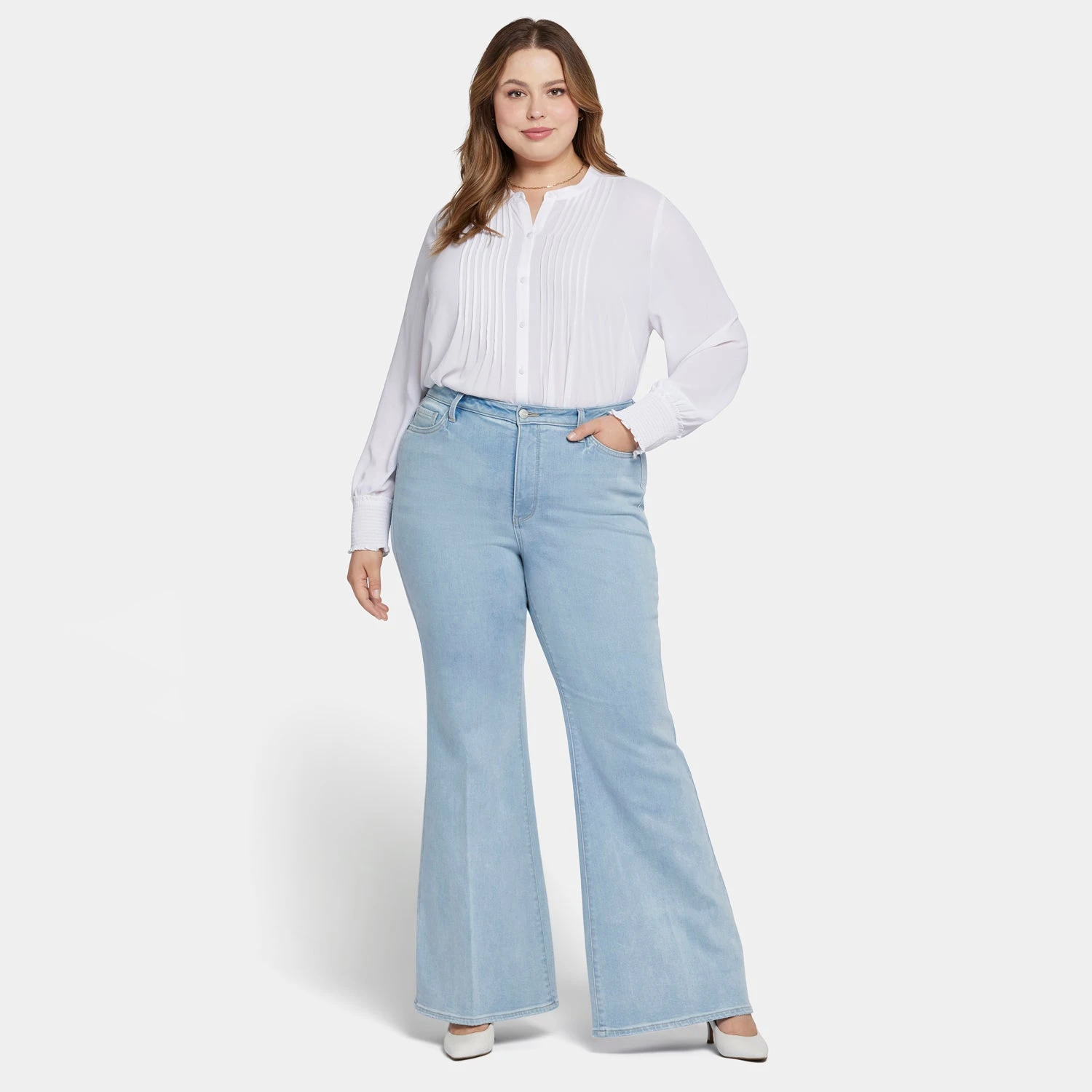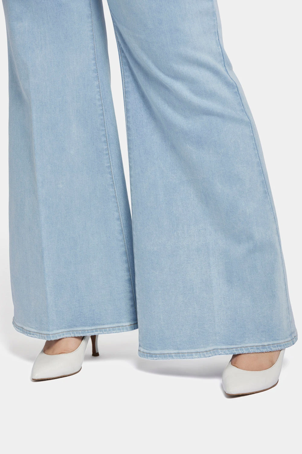 NYDJ’s Mia Palazzo Jeans in Plus Size make a bold, breezy statement with their super-flared legs. Sitting high on the waist, this pair has a flattering fit that hugs the hips and thighs and is detailed with center-leg creases. Our Lift Tuck® Technology uses a proprietary slimming panel with a patented criss-cross design to shape and support your curves for an always-sleek silhouette. Features five-pocket styling and a zip fly with button closure. This jean is made with earth-friendly methods that result in reduced consumption of water, chemicals and/or energy.