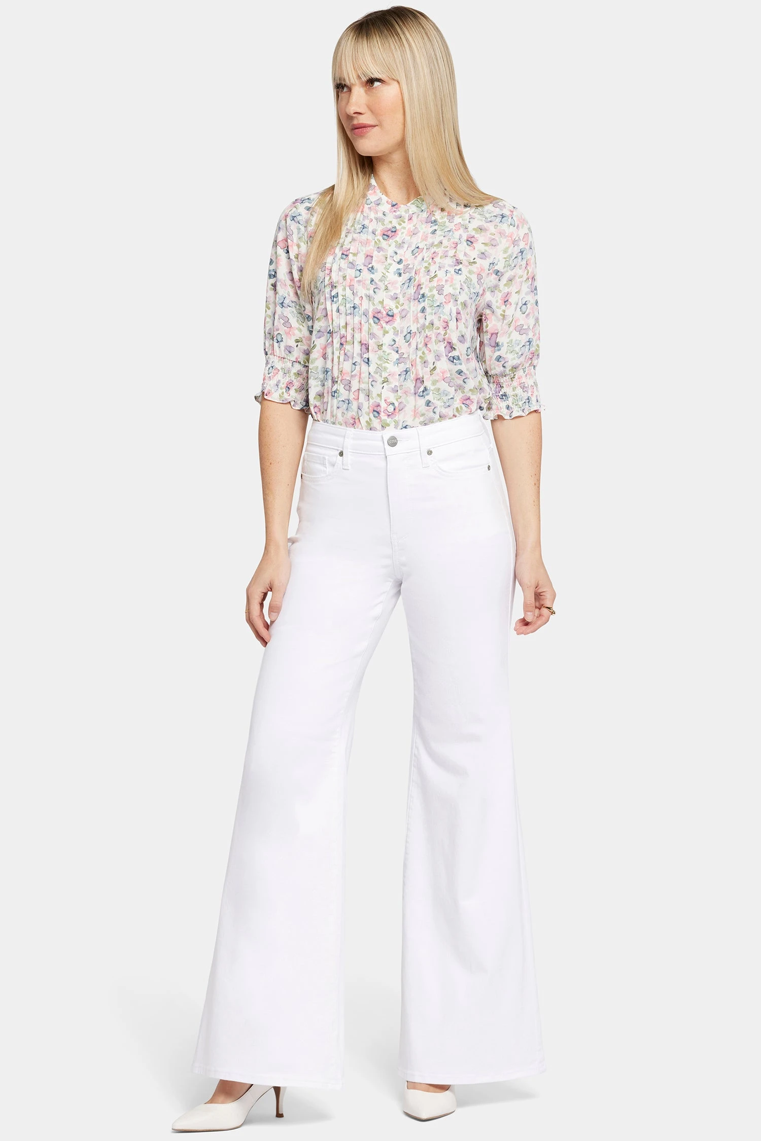 NYDJ’s Mia Palazzo Jeans make a bold, breezy statement with their super-flared legs. Sitting high on the waist, this pair has a flattering fit that hugs the hips and thighs and is detailed with center-leg creases. Our Lift Tuck® Technology uses a proprietary slimming panel with a patented criss-cross design to shape and support your curves for an always-sleek silhouette. Features five-pocket styling and a zip fly with button closure. This jean is made with earth-friendly methods that result in reduced consumption of water, chemicals and/or energy.