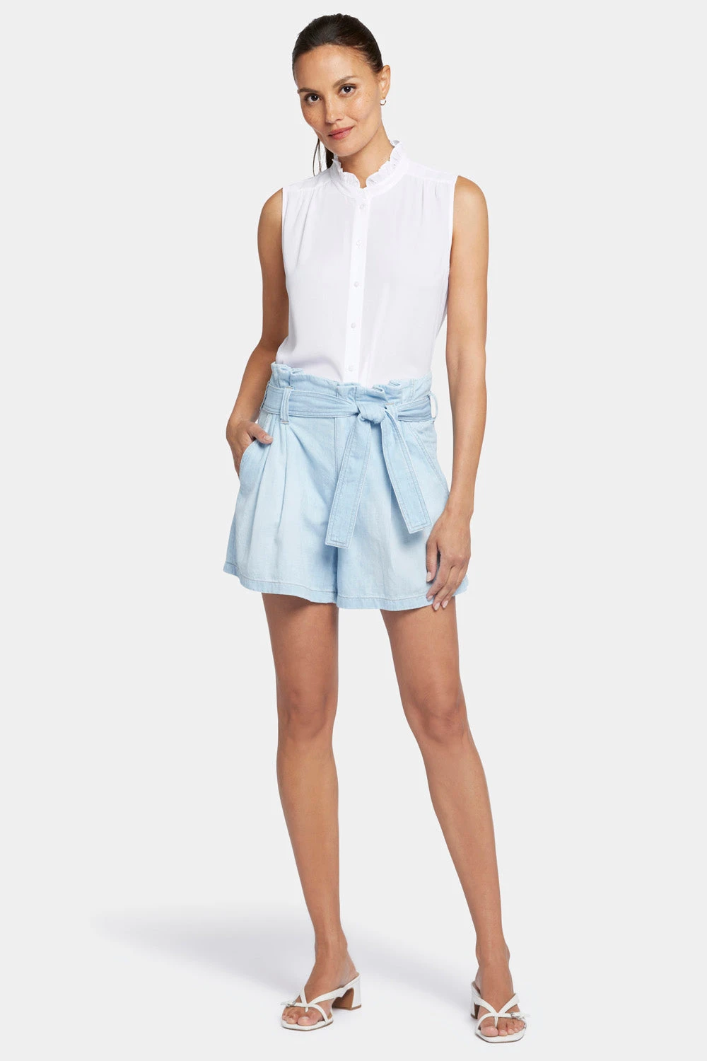 NYDJ’s Paper Bag Shorts with High Rise are the perfect blend of style and comfort. These shorts have a stunning paper-bag-style waist with pleats and a front sash tie, adding a chic touch. The lightweight denim fabric is soft and breathable, making it perfect for all-day wear. Finished with front slash pockets and back welt pockets.